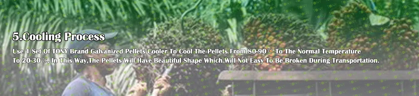 Формоването е основният процес. Пелетизаторът с вертикална пръстеновидна матрица използва високо налягане между ролките и пръстеновидната матрица, за да екструдира суровината през отворите на матрицата. Естественият лигнин в палмовия материал действа като свързващо вещество. След екструдиране пелетите се нарязват на 2-5 cm дължини. В етапа на охлаждане противоточен охладител намалява температурата на горещите пелети (70-90°C) до стайна температура, като същевременно намалява съдържанието на влага до под 10%, за да предотврати образуването на бучки и растежа на мухъл. И накрая, автоматична машина за претегляне и опаковане завършва процеса. Различните видове пелети имат леки вариации; горивните пелети изискват по-високо налягане на формоване и без свързващи вещества, докато пелетите за градинарство изискват по-ниско налягане и могат да включват екологично чисти добавки.