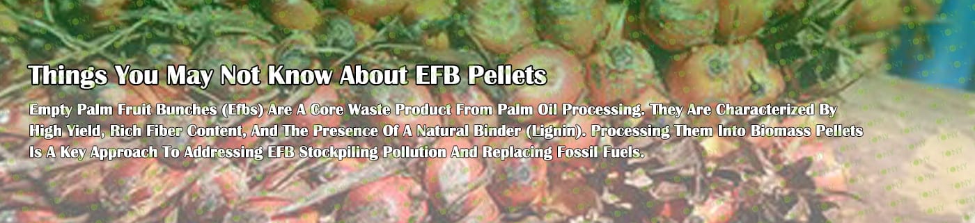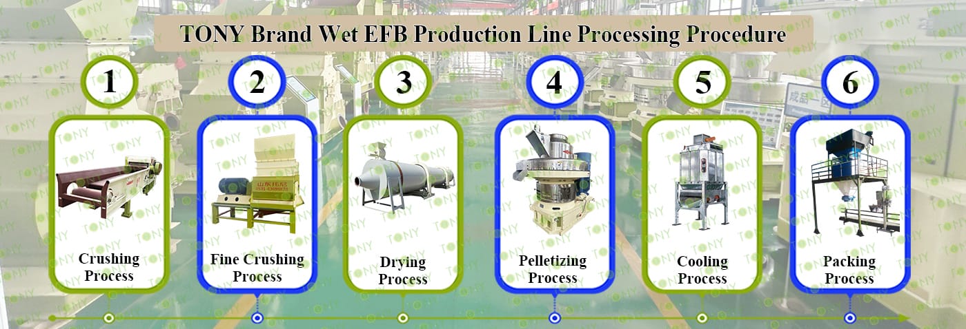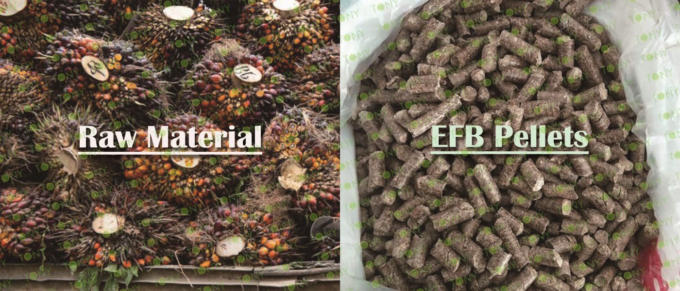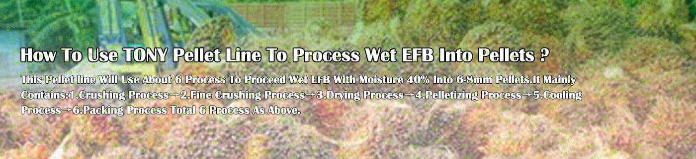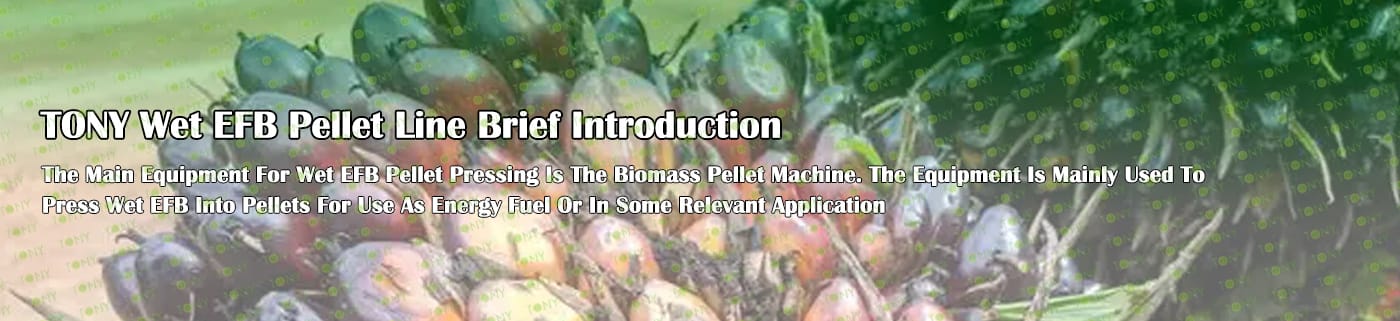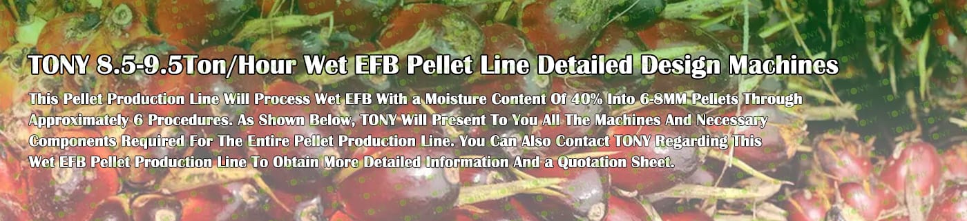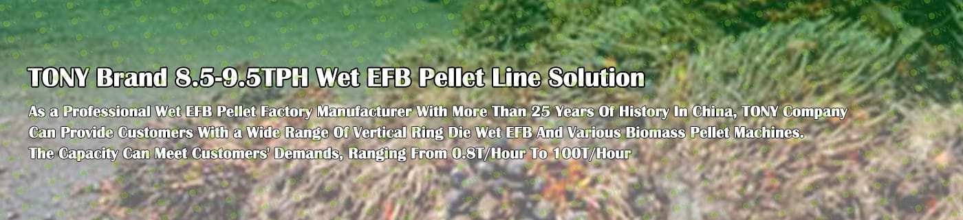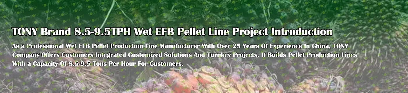 Заводът за производство на пелети с мокър EFB с марка TONY 8,5-9,5 тона/час може да използва мокър EFB като основна суровина. След предварителна обработка и обработка се втвърдява в пелетно гориво EFB с висока плътност. Това гориво е идеален заместител на въглищата и петрола и играе роля в енергоспестяването и намаляването на емисиите. В момента той е широко използван в региони, богати на EFB ресурси.