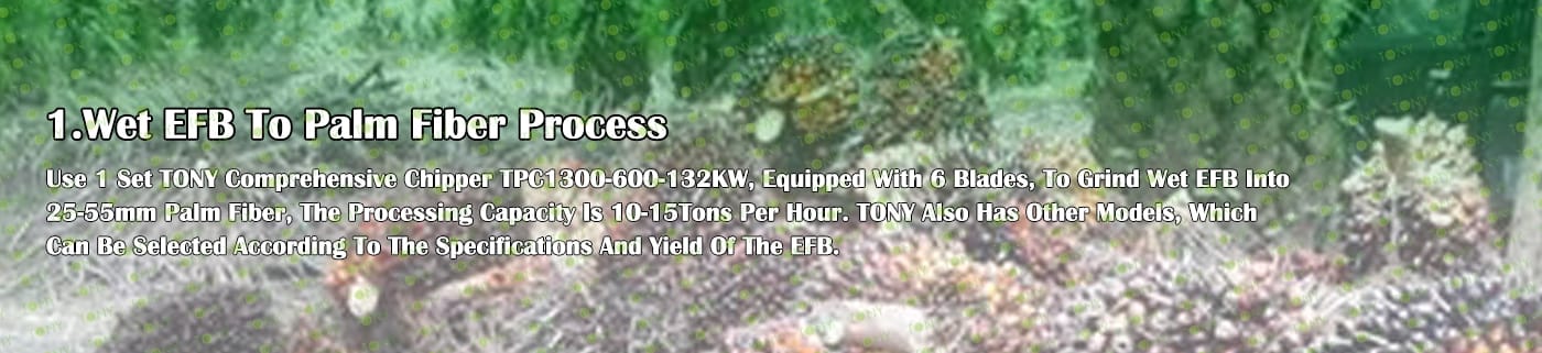 A. Този процес се използва главно за смилане на EFB в палмово влакно с размер 25-55 мм. Размерът на окончателното палмово влакно може да се регулира чрез промяна на различни размери на ситата и добавяне на летящи ножове в машината за дробене на дървесина.