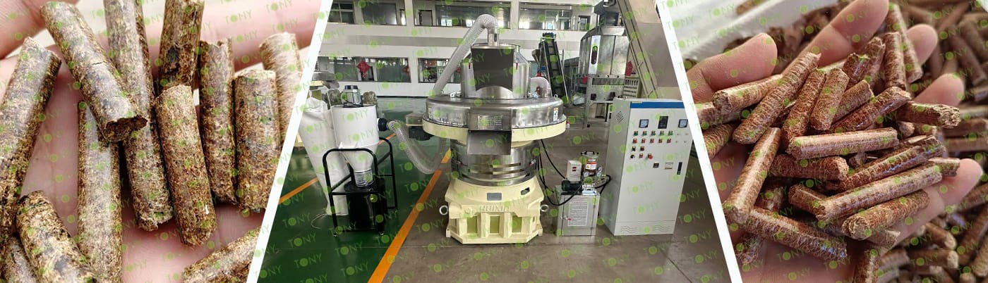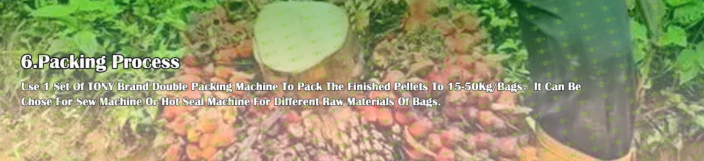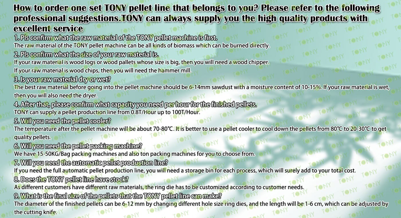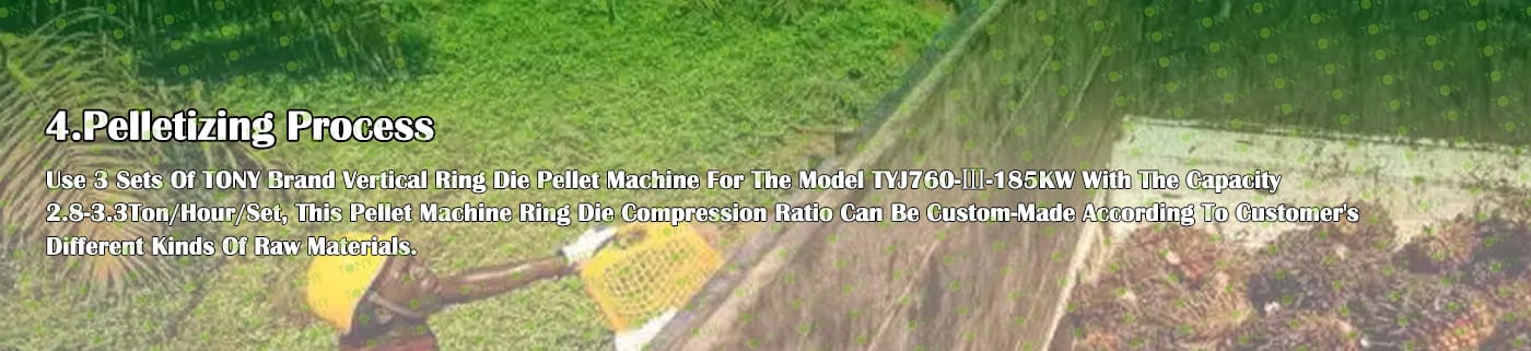 4. Основна машина: цялостна дробилка, чукова мелница, сушилня с ротационен барабан, машина за пелети TONY TYJ760-Ⅲ-185KW, охладител за пелети, опаковъчна машина и лентови транспортьори