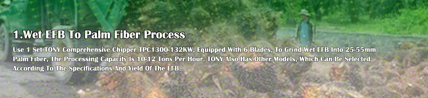 A. Този процес се използва главно за смилане на EFB в палмово влакно с размер 25-55 мм. Размерът на окончателното палмово влакно може да се регулира чрез промяна на различни размери на ситата и добавяне на летящи ножове в машината за дробене на дървесина.