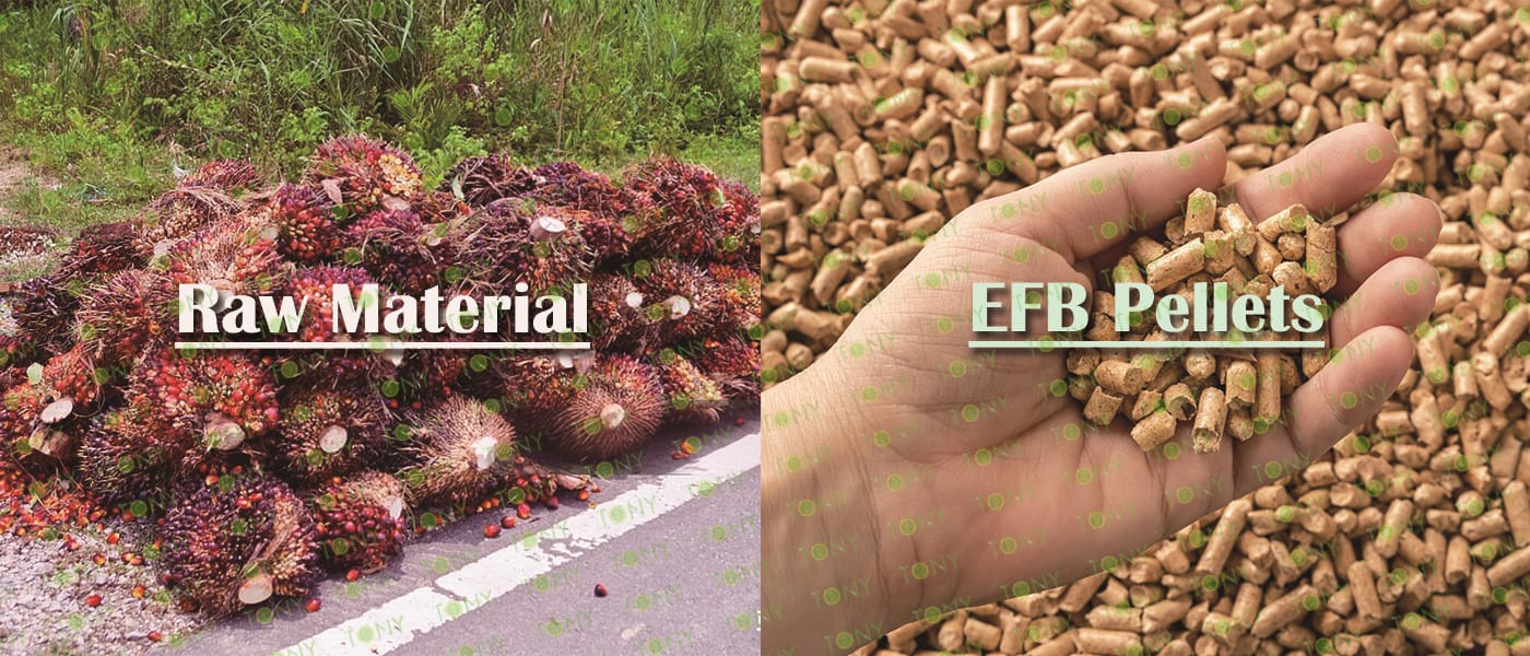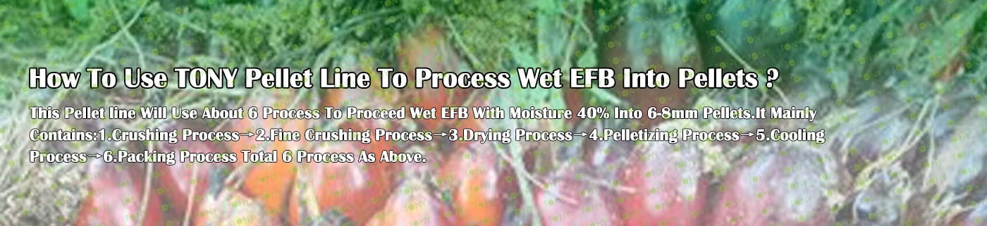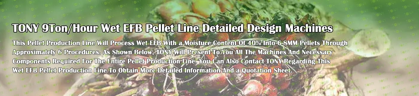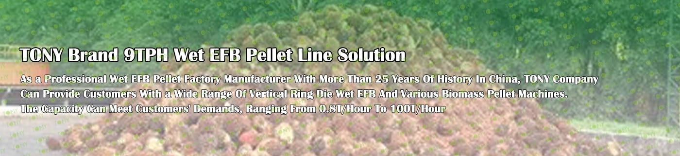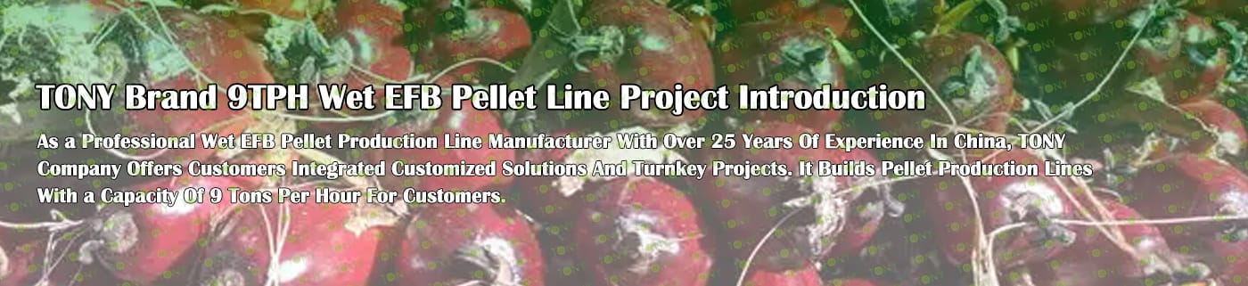 Заводът за производство на пелети с мокър EFB с марка TONY 9 тона/час може да използва мокър EFB като основна суровина. След предварителна обработка и обработка се втвърдява в пелетно гориво EFB с висока плътност. Това гориво е идеален заместител на въглищата и петрола и играе роля в енергоспестяването и намаляването на емисиите. В момента той е широко използван в региони, богати на EFB ресурси.