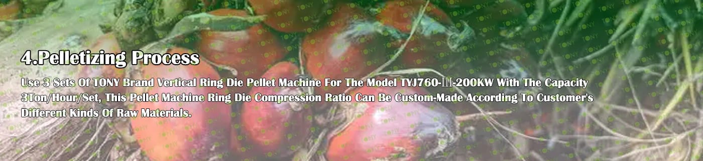 4. Основна машина: цялостна дробилка, чукова мелница, сушилня с ротационен барабан, машина за пелети TONY TYJ760-Ⅲ-200KW, охладител за пелети, опаковъчна машина и лентови транспортьори