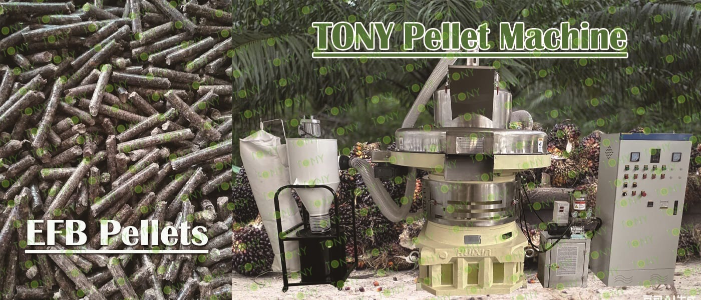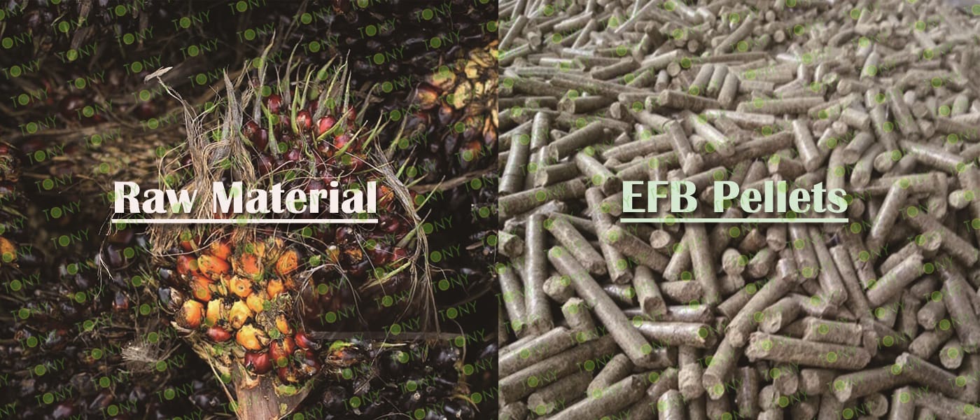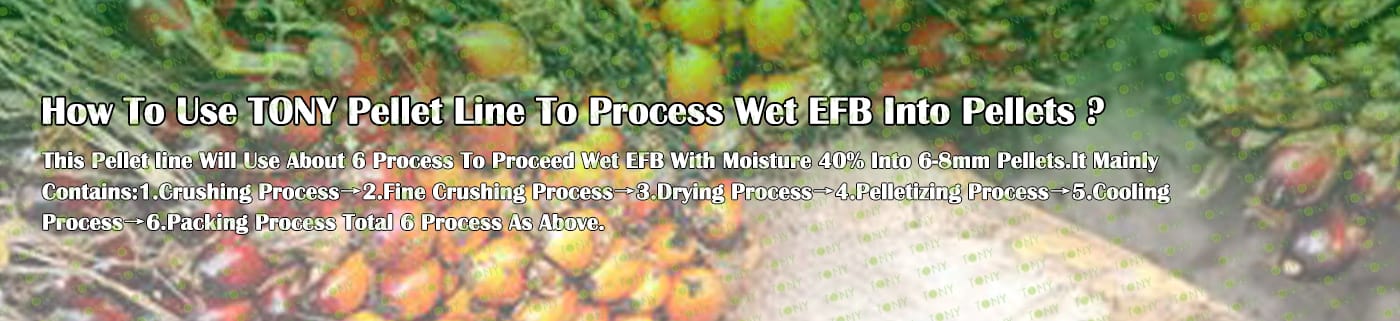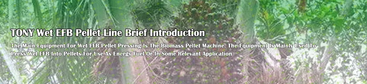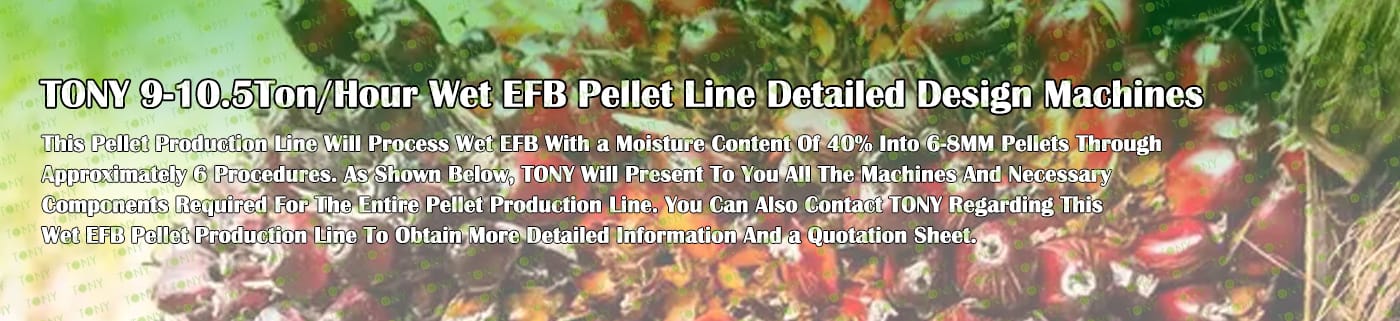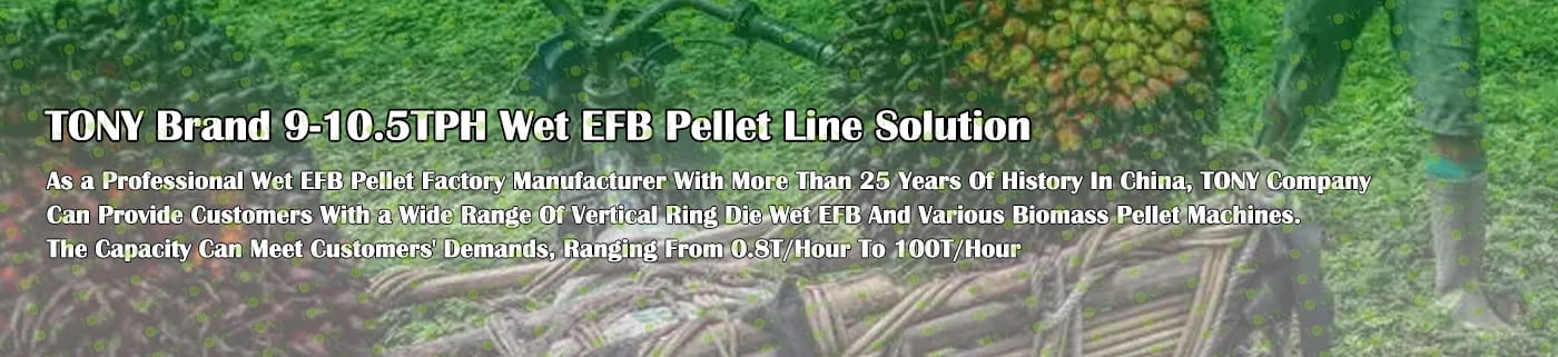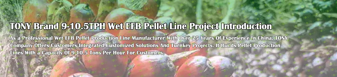 Заводът за производство на пелети с мокър EFB с марка TONY 9-10,5 тона/час може да използва мокър EFB като основна суровина. След предварителна обработка и обработка се втвърдява в пелетно гориво EFB с висока плътност. Това гориво е идеален заместител на въглищата и петрола и играе роля в енергоспестяването и намаляването на емисиите. В момента той е широко използван в региони, богати на EFB ресурси.