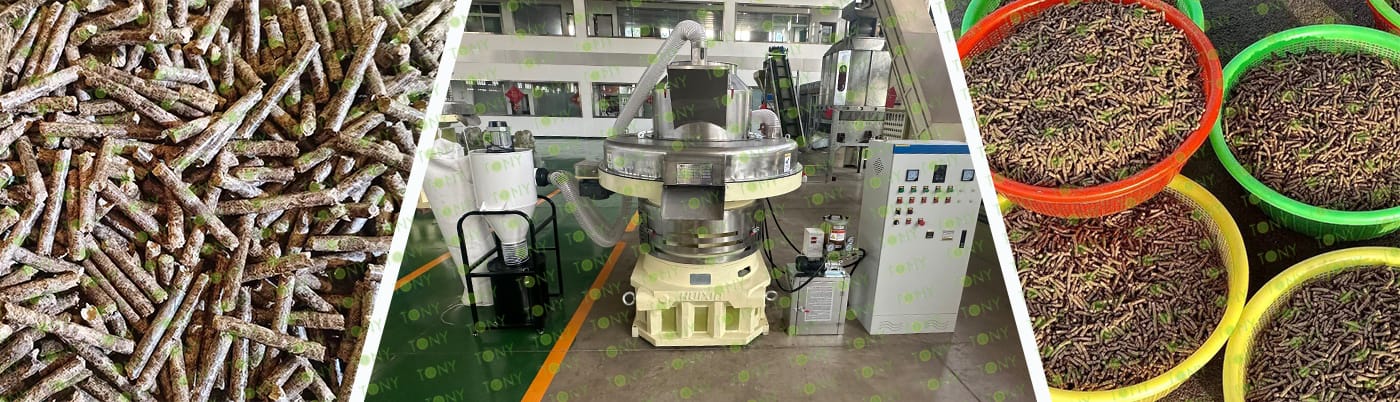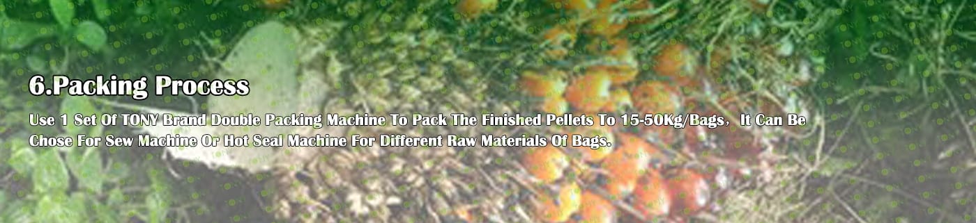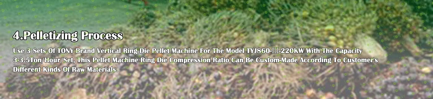 4. Основна машина: цялостна дробилка, чукова мелница, сушилня с ротационен барабан, машина за пелети TONY TYJ860-Ⅲ-220KW, охладител за пелети, опаковъчна машина и лентови транспортьори