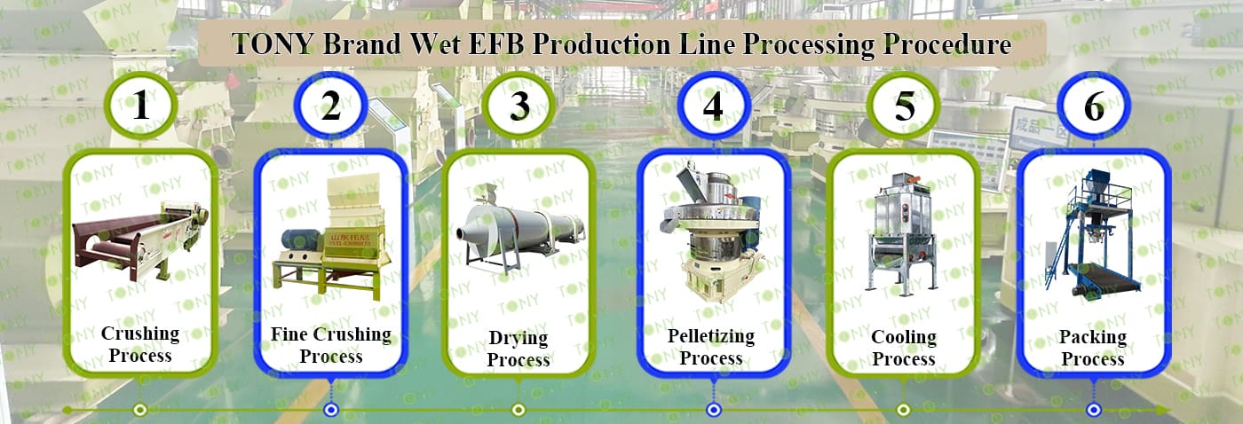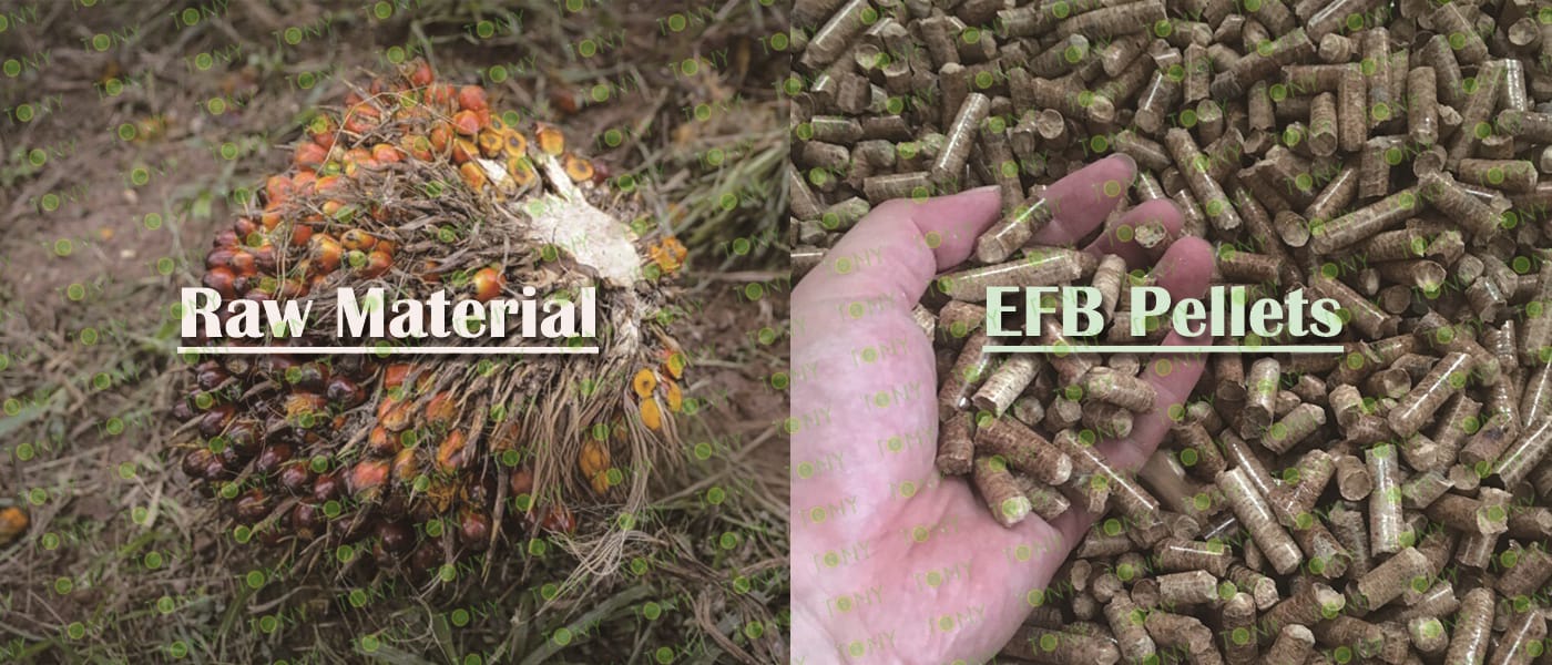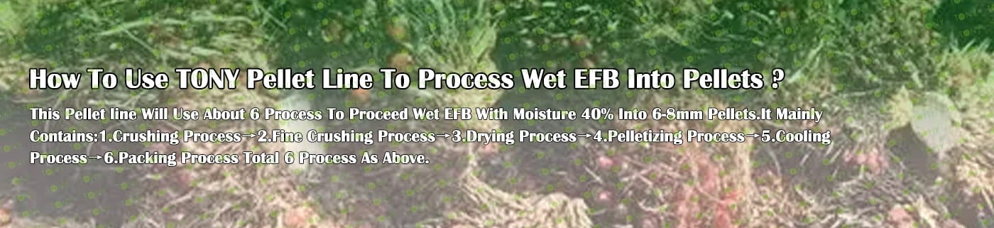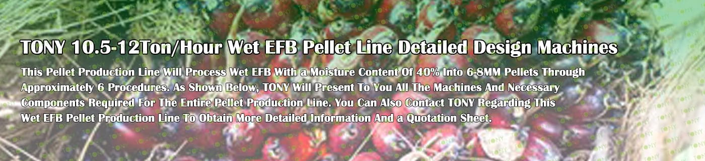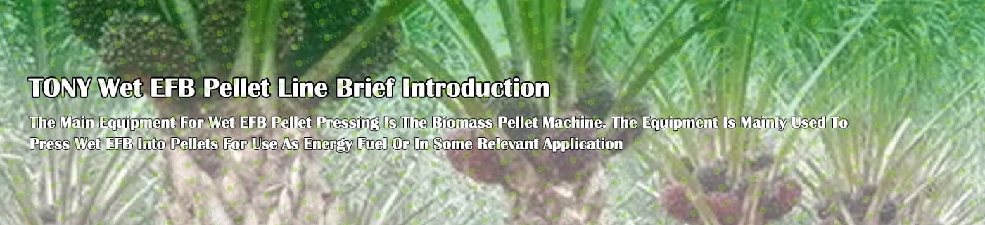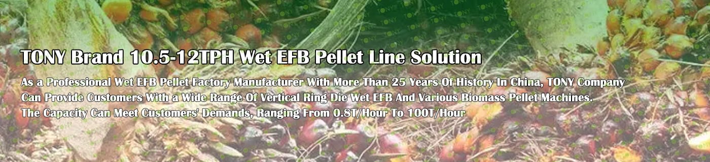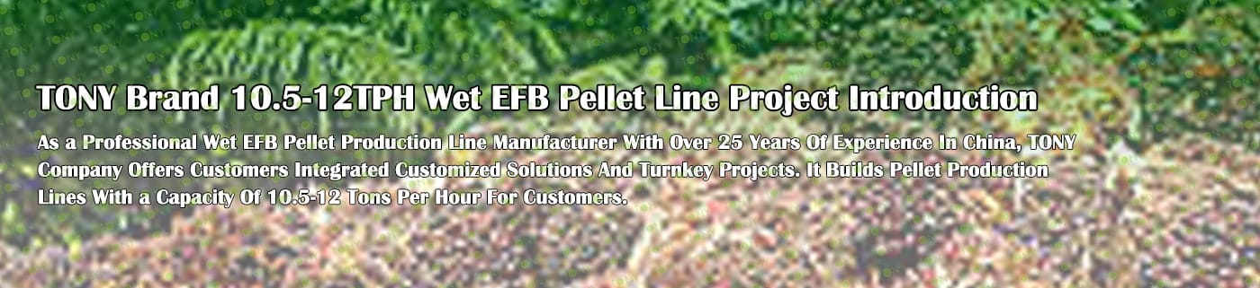 Заводът за производство на пелети с мокър EFB с марка TONY 10,5-12 тона/час може да използва мокър EFB като основна суровина. След предварителна обработка и обработка се втвърдява в пелетно гориво EFB с висока плътност. Това гориво е идеален заместител на въглищата и петрола и играе роля в енергоспестяването и намаляването на емисиите. В момента той е широко използван в региони, богати на EFB ресурси.