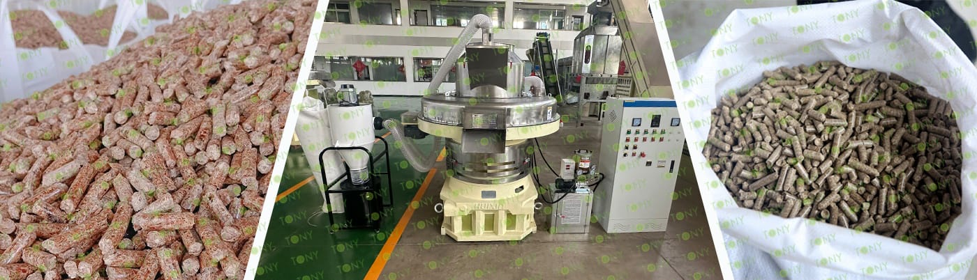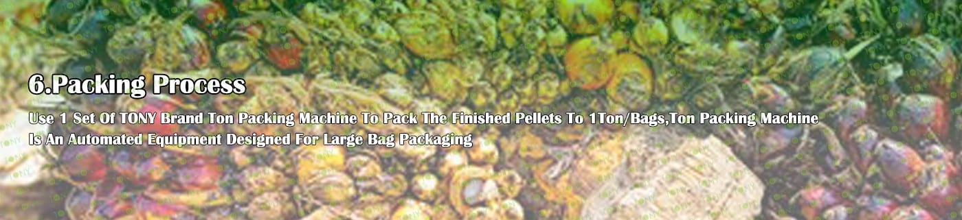 4. Основна машина: цялостна дробилка, чукова мелница, въртяща се барабанна сушилня, машина за пелети TONY TYJ860-Ⅲ-250KW, охладител за пелети, опаковъчна машина и лентови транспортьори