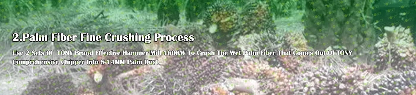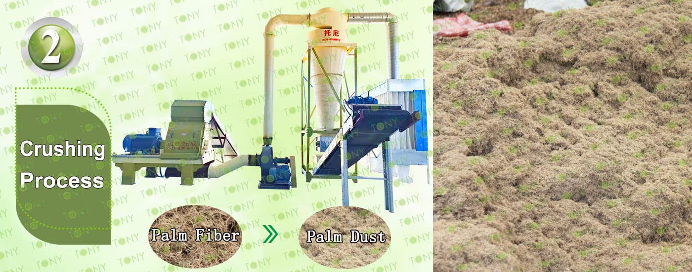 A. Този процес се използва главно за смачкване на 25-55 mm палмови влакна в 8-14 mm палмов прах.