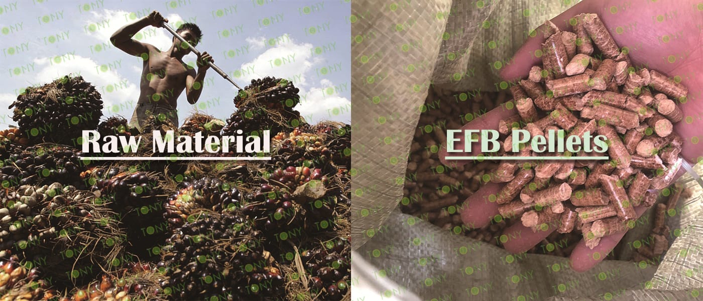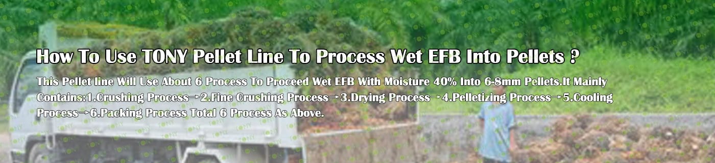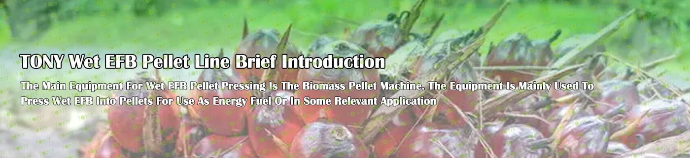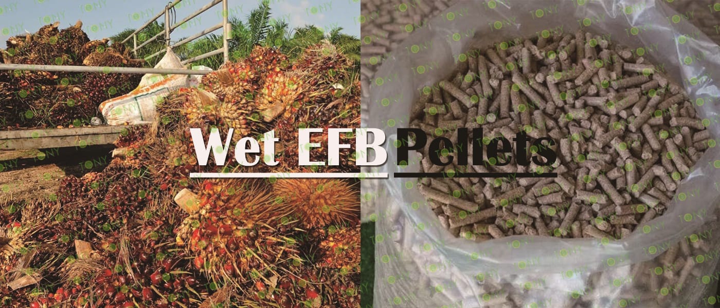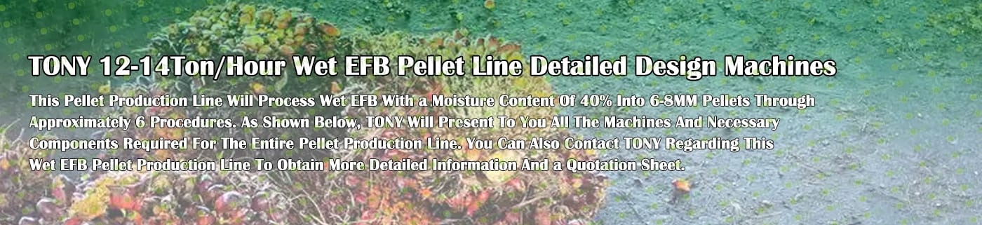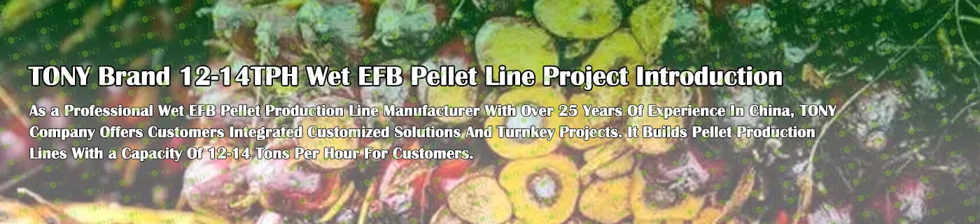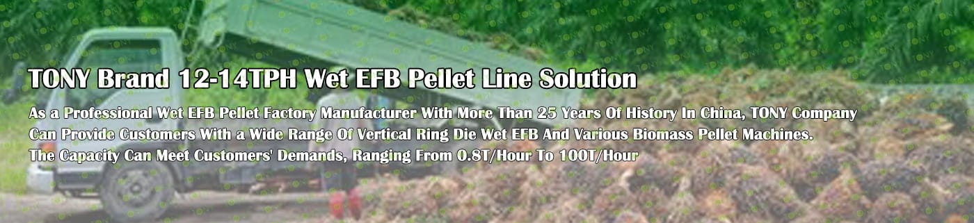 Заводът за производство на пелети с мокър EFB с марка TONY 12-14 тона/час може да използва мокър EFB като основна суровина. След предварителна обработка и обработка се втвърдява в пелетно гориво EFB с висока плътност. Това гориво е идеален заместител на въглищата и петрола и играе роля в енергоспестяването и намаляването на емисиите. В момента той е широко използван в региони, богати на EFB ресурси.