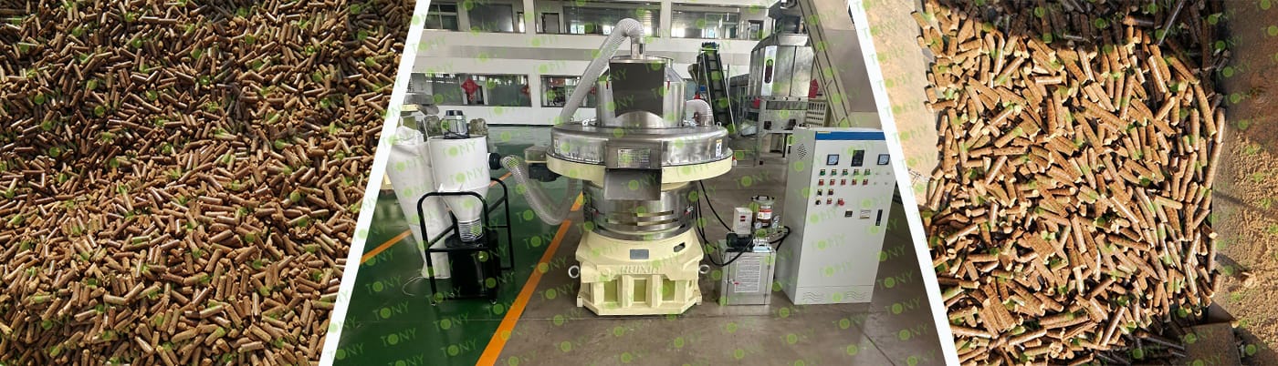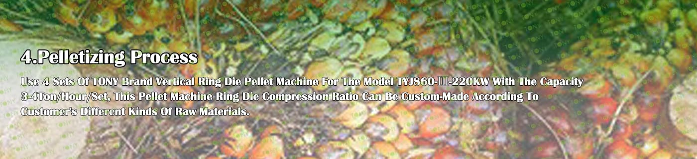 4. Основна машина: цялостна дробилка, чукова мелница, сушилня с ротационен барабан, машина за пелети TONY TYJ860-Ⅲ-220KW, охладител за пелети, опаковъчна машина и лентови транспортьори