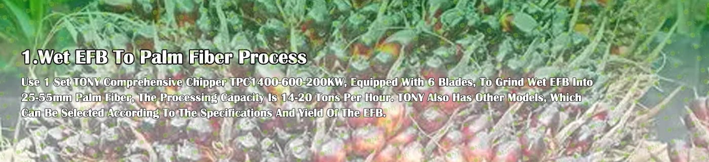 A. Този процес се използва главно за смилане на EFB в палмово влакно с размер 25-55 мм. Размерът на окончателното палмово влакно може да се регулира чрез промяна на различни размери на ситата и добавяне на летящи ножове в машината за дробене на дървесина.