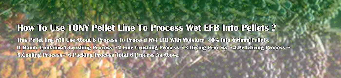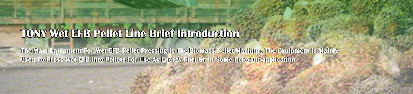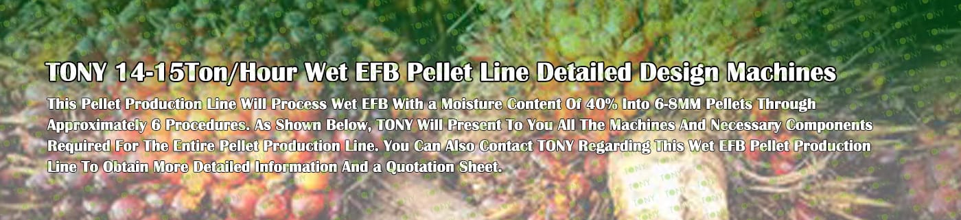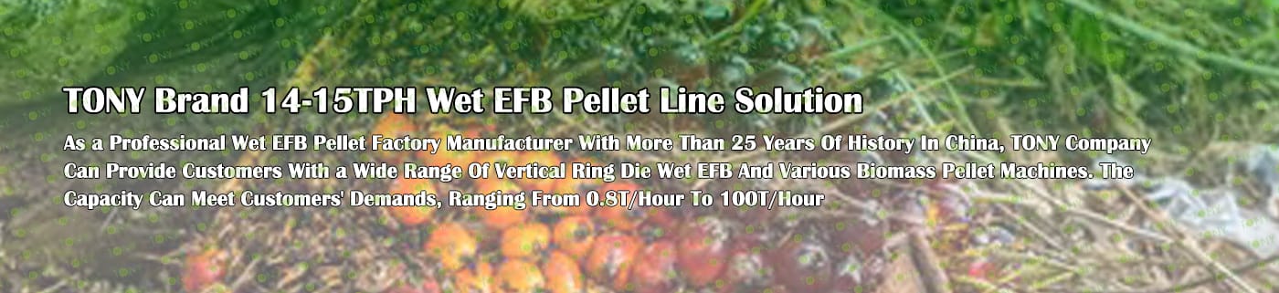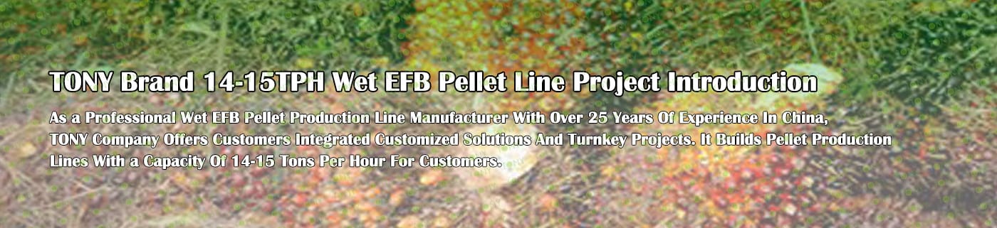 Заводът за производство на пелети с мокър EFB с марка TONY 14-15 тона/час може да използва мокър EFB като основна суровина. След предварителна обработка и обработка се втвърдява в пелетно гориво EFB с висока плътност. Това гориво е идеален заместител на въглищата и петрола и играе роля в енергоспестяването и намаляването на емисиите. В момента той е широко използван в региони, богати на EFB ресурси.
