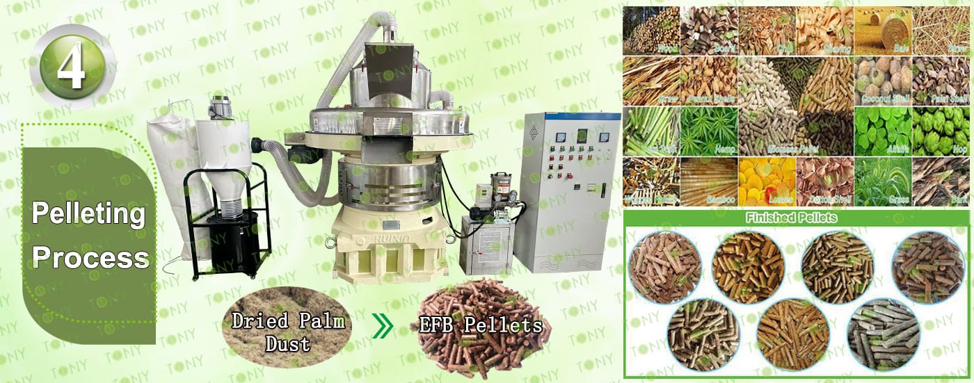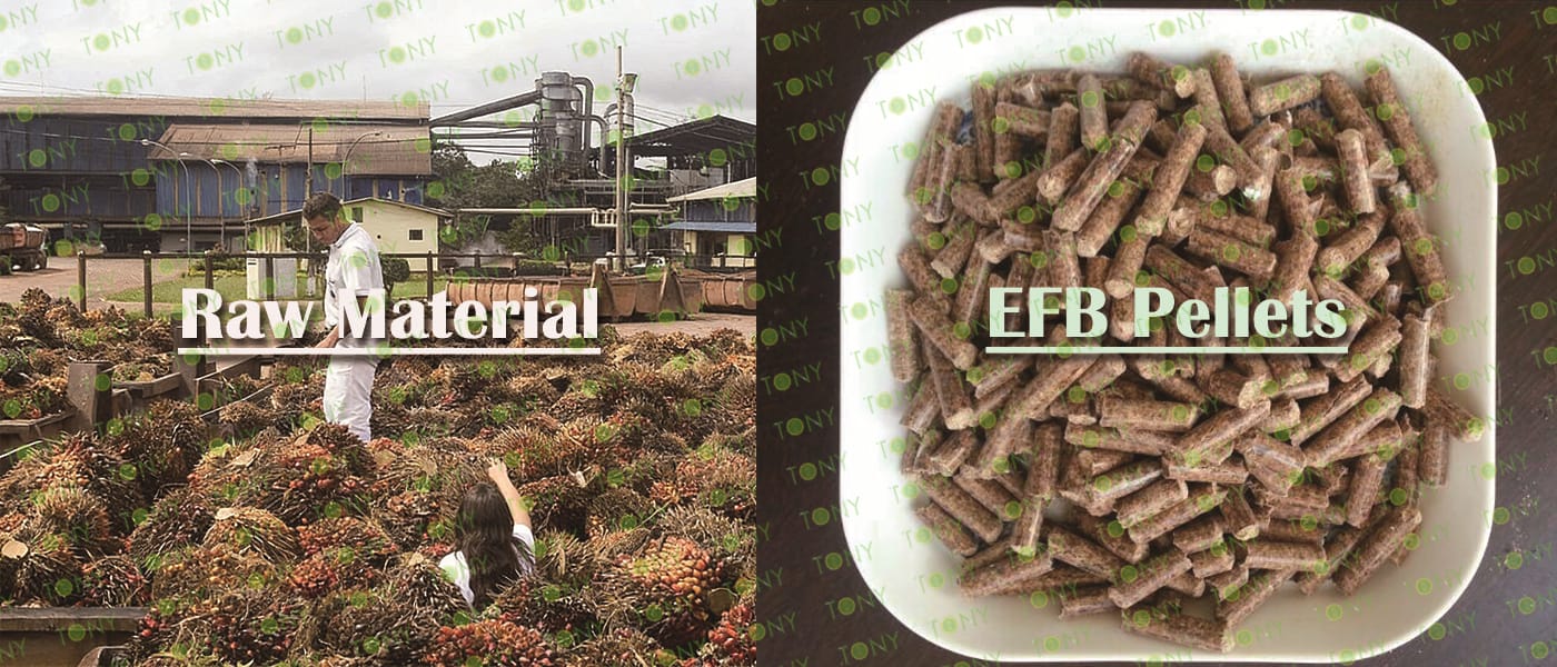 Преработката на EFB (празни гроздове от палмови плодове) в пелети от биомаса е важен начин за реализиране на оползотворяването на ресурсите от палмови отпадъци и замяна на енергията от изкопаеми горива. Ядрото на процеса е да се преобразува насипен EFB с висока влажност в чисто гориво с висока плътност, лесно за съхранение и транспорт чрез процеса на „предварителна обработка – сушене – раздробяване – пелетизиране – охлаждане и опаковане“.