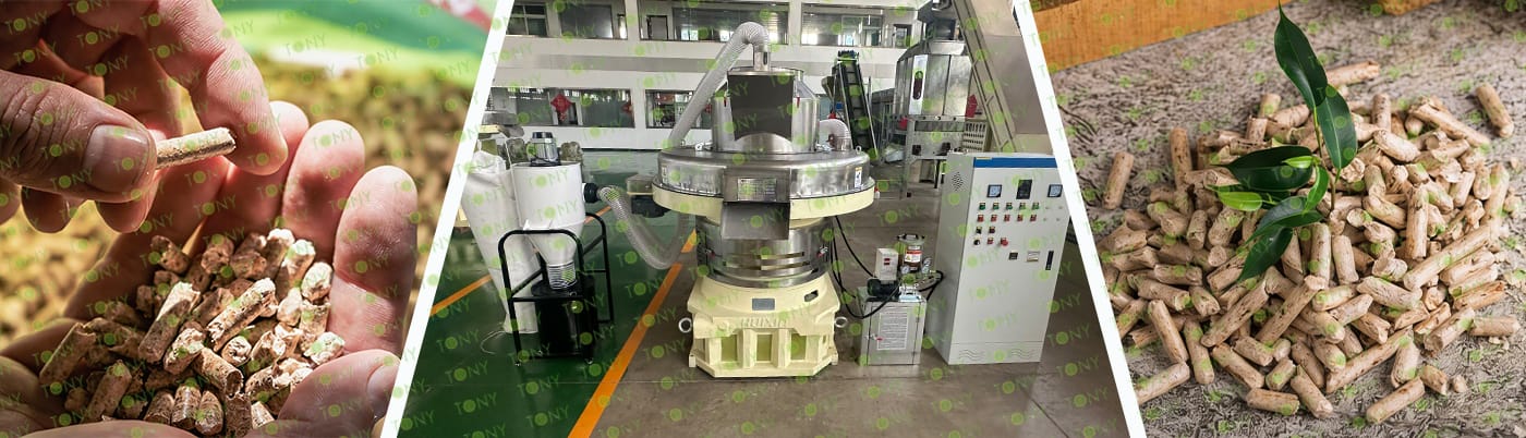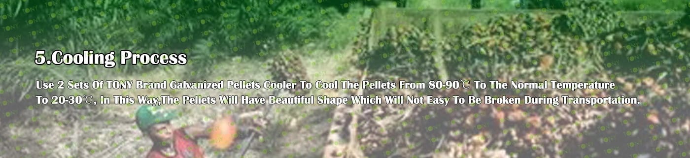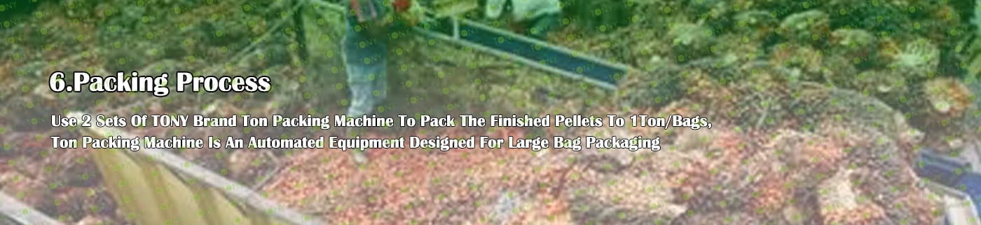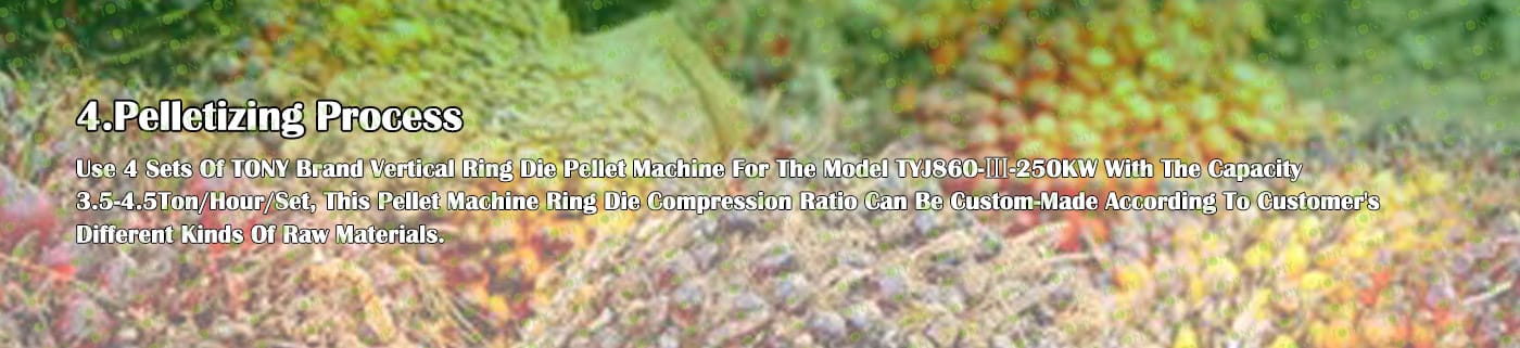 4. Основна машина: цялостна дробилка, чукова мелница, въртяща се барабанна сушилня, машина за пелети TONY TYJ860-Ⅲ-250KW, охладител за пелети, опаковъчна машина и лентови транспортьори