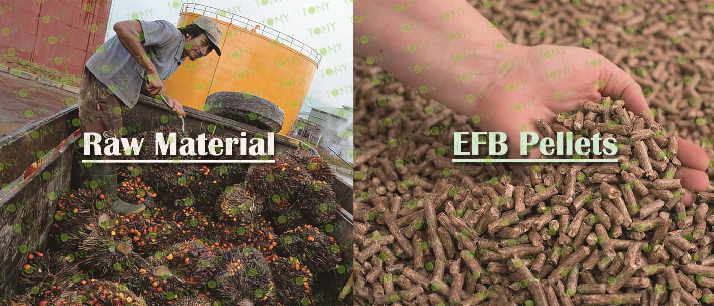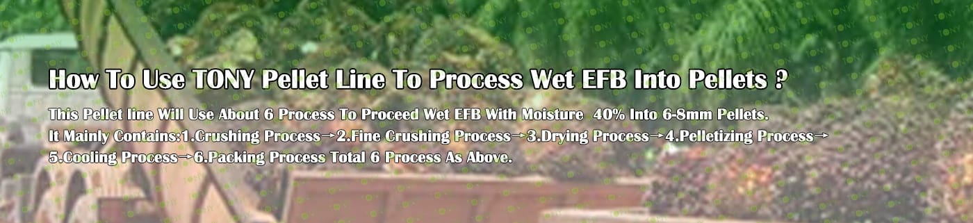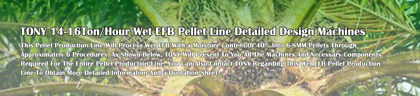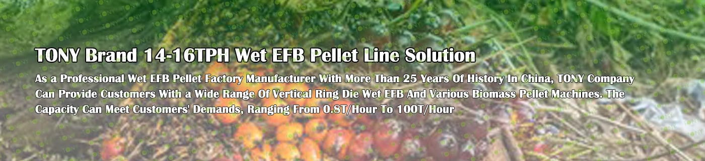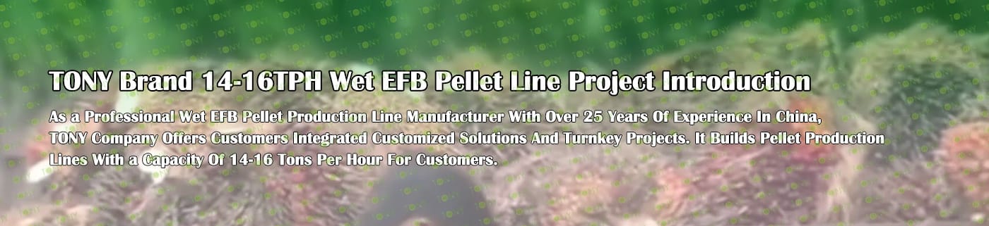 Заводът за производство на пелети с мокър EFB с марка TONY 14-16 тона/час може да използва мокър EFB като основна суровина. След предварителна обработка и обработка се втвърдява в пелетно гориво EFB с висока плътност. Това гориво е идеален заместител на въглищата и петрола и играе роля в енергоспестяването и намаляването на емисиите. В момента той е широко използван в региони, богати на EFB ресурси.