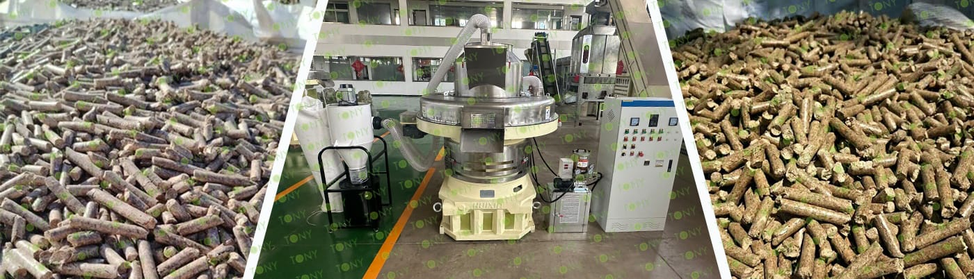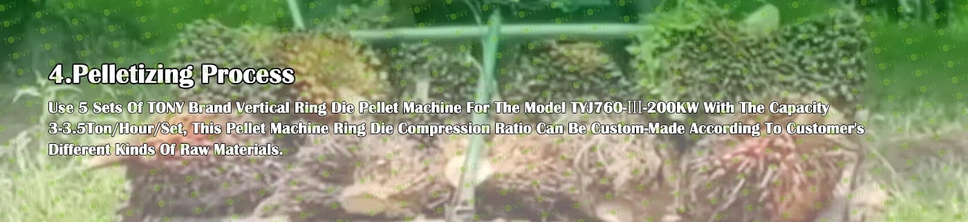 4. Основна машина: цялостна дробилка, чукова мелница, сушилня с ротационен барабан, машина за пелети TONY TYJ760-Ⅲ-200KW, охладител за пелети, опаковъчна машина и лентови транспортьори