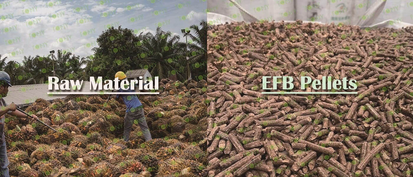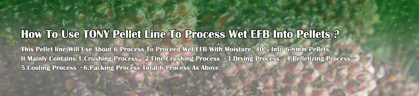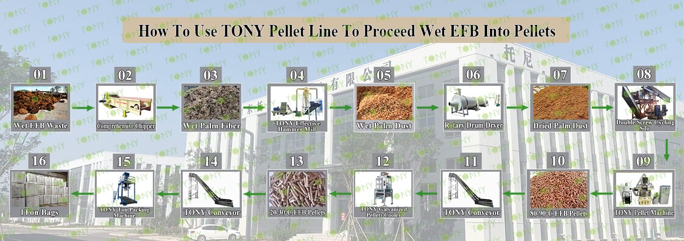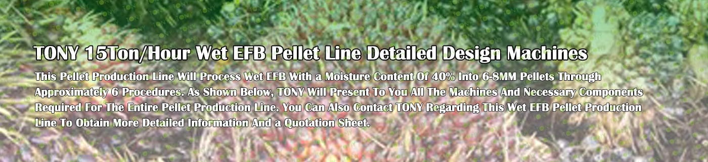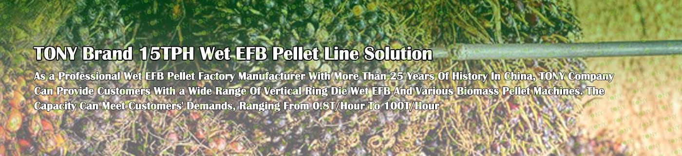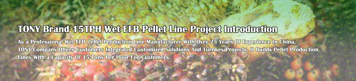 Заводът за производство на пелети с мокър EFB с марка TONY 15 тона/час може да използва мокър EFB като основна суровина. След предварителна обработка и обработка се втвърдява в пелетно гориво EFB с висока плътност. Това гориво е идеален заместител на въглищата и петрола и играе роля в енергоспестяването и намаляването на емисиите. В момента той е широко използван в региони, богати на EFB ресурси.
