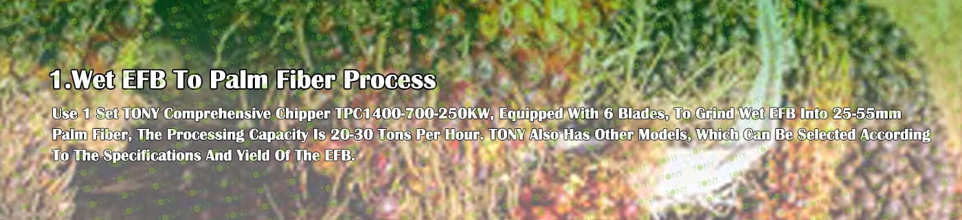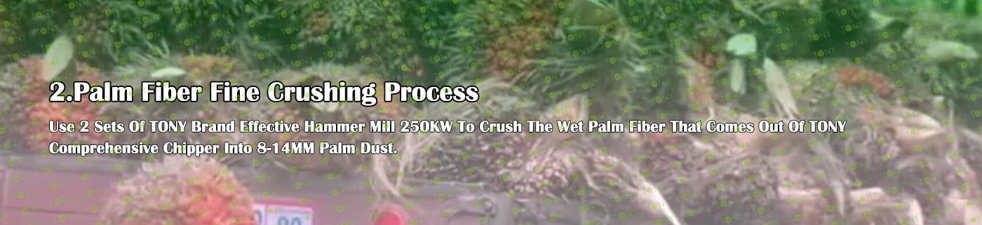 A. Този процес се използва главно за смачкване на 25-55 mm палмови влакна в 8-14 mm палмов прах.