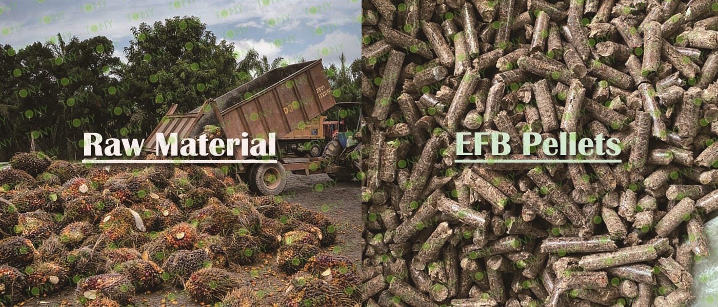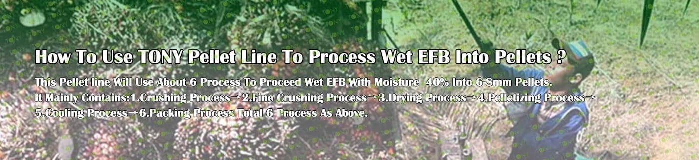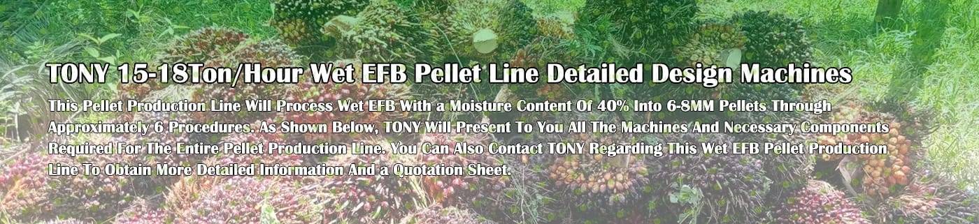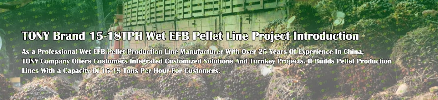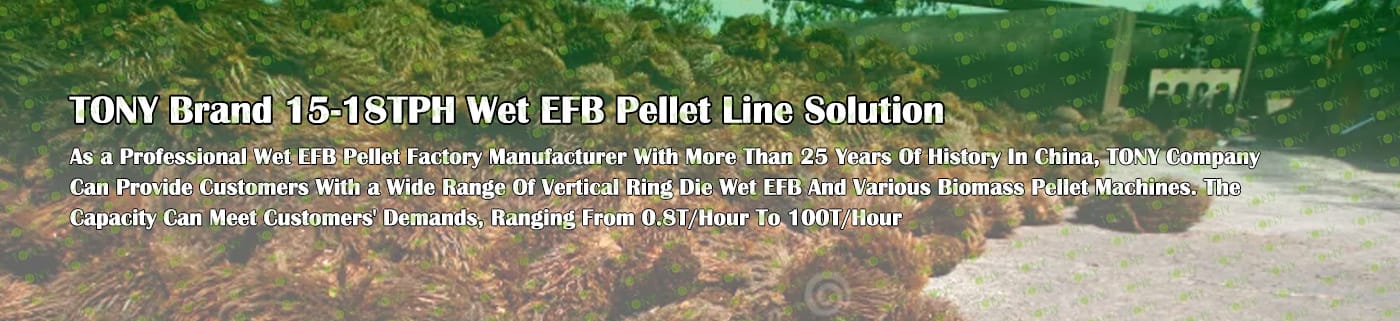 Заводът за производство на пелети с мокър EFB с марка TONY 15-18 тона/час може да използва мокър EFB като основна суровина. След предварителна обработка и обработка се втвърдява в пелетно гориво EFB с висока плътност. Това гориво е идеален заместител на въглищата и петрола и играе роля в енергоспестяването и намаляването на емисиите. В момента той е широко използван в региони, богати на EFB ресурси.