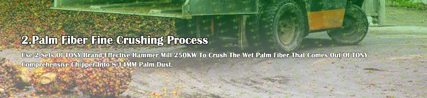 A. Този процес се използва главно за смачкване на 25-55 mm палмови влакна в 8-14 mm палмов прах.