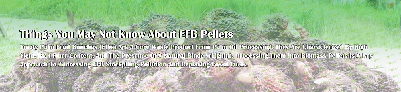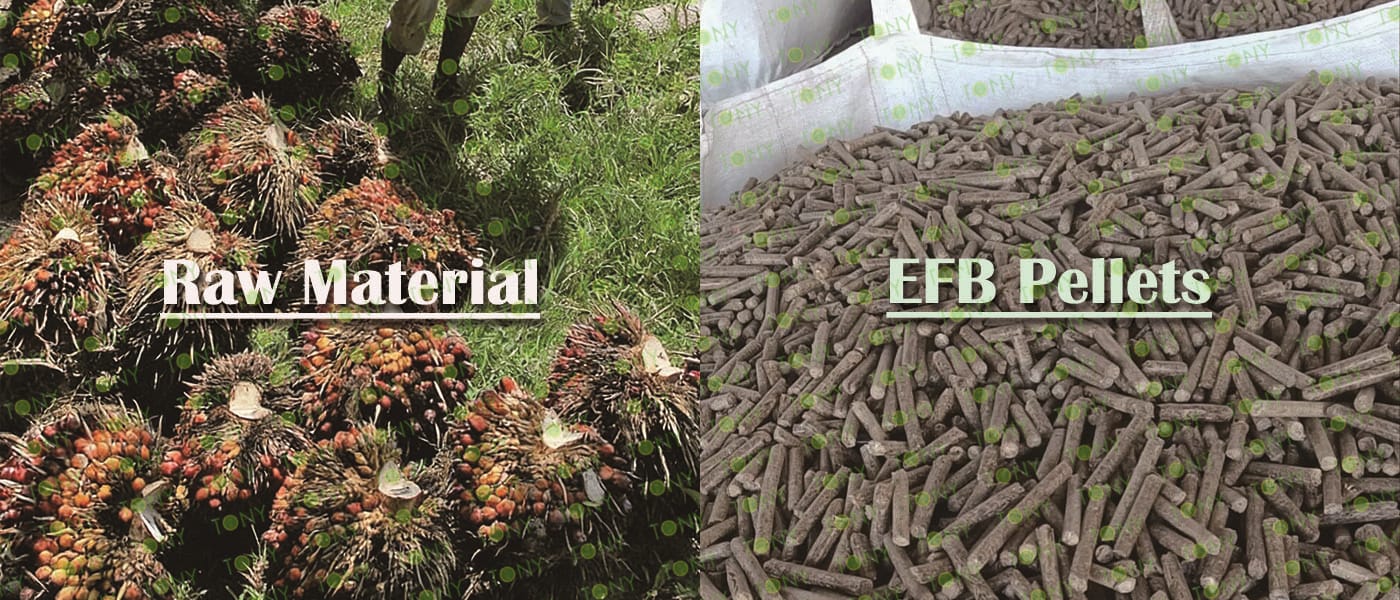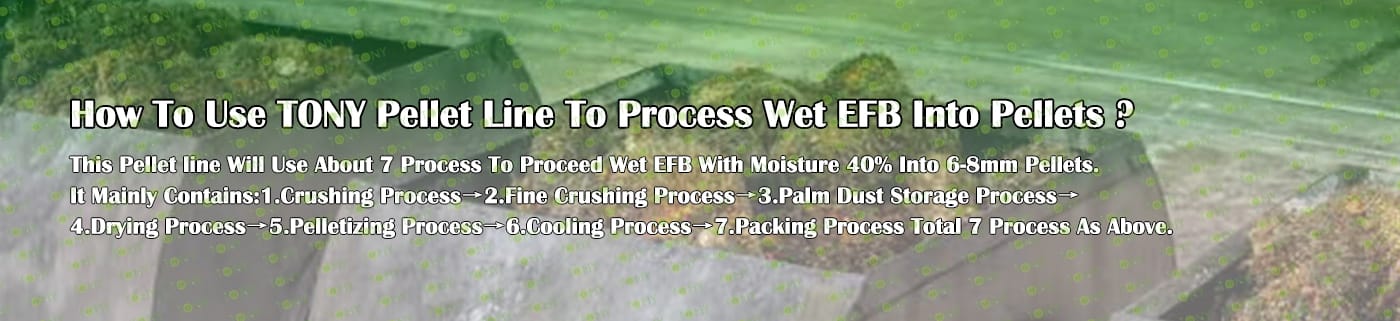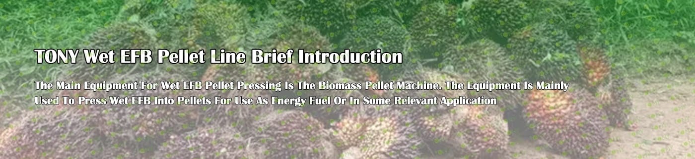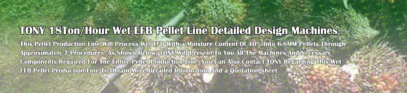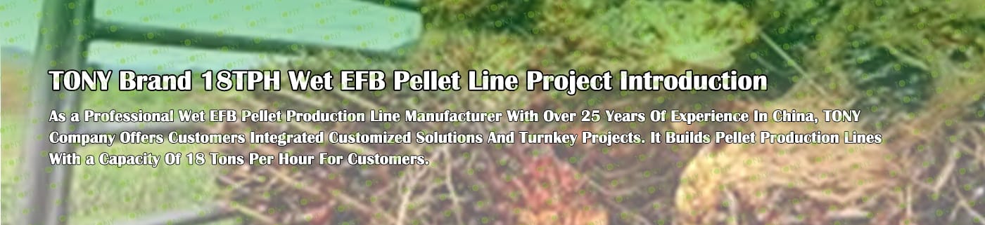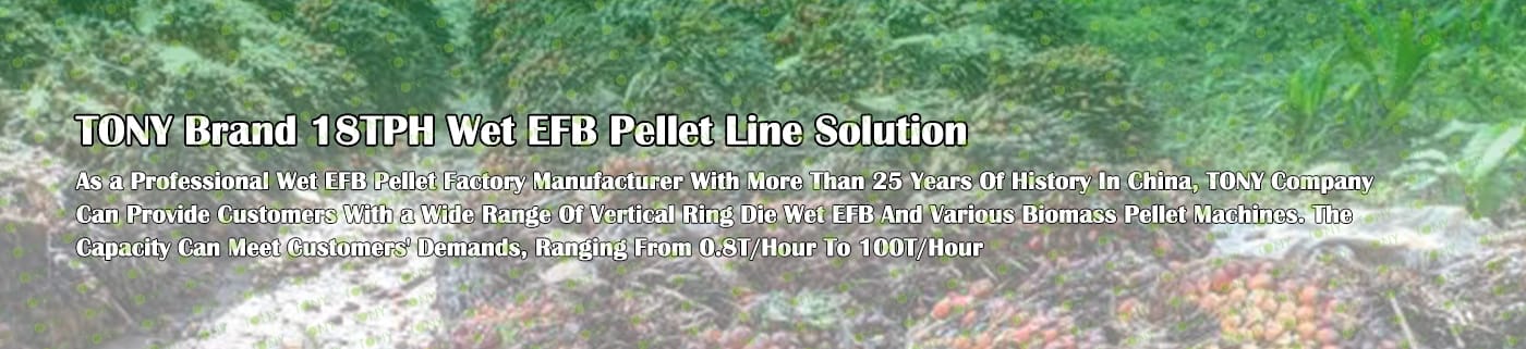 Заводът за производство на пелети с мокър EFB с марка TONY 18 тона/час може да използва мокър EFB като основна суровина. След предварителна обработка и обработка се втвърдява в пелетно гориво EFB с висока плътност. Това гориво е идеален заместител на въглищата и петрола и играе роля в енергоспестяването и намаляването на емисиите. Понастоящем той се използва широко в региони, богати на EFB ресурси.
