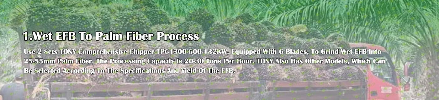 A. Този процес се използва главно за смилане на EFB в палмово влакно с размер 25-55 мм. Размерът на окончателното палмово влакно може да се регулира чрез промяна на различни размери на ситата и добавяне на летящи ножове в машината за дробене на дървесина.