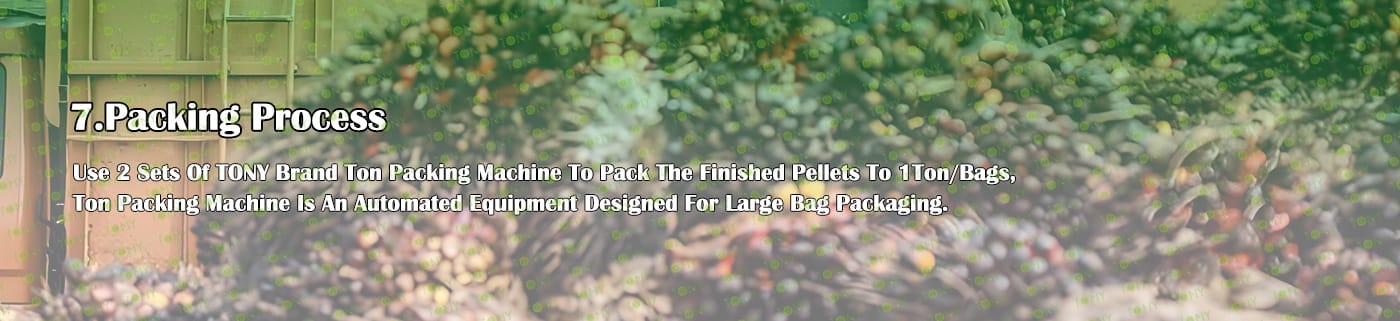 6. Основно оборудване: Изчерпателна дробилка- TPC1300-600-132KW, ефективна чукова мелница-TFD75*132-132KW, голям хидравличен силоз за съхранение TONY, сушилня с ротационен барабан-2,8*24m, машина за пелети TONY- TYJ760-Ⅲ-200KW, поцинковани пелети Охладител, машина за пакетиране на тонове и лентови транспортьори