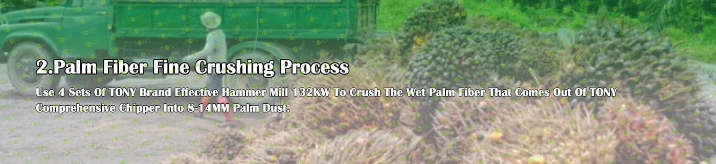 A. Този процес се използва главно за смачкване на 25-55 mm палмови влакна в 8-14 mm палмов прах.