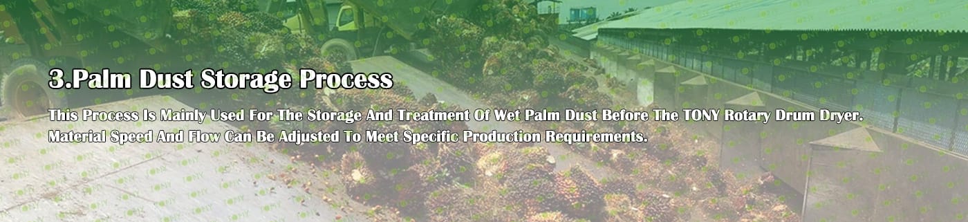 B. Голям хидравличен силоз за съхранение на марката TONY за съхранение на палмовия прах, който излиза от чуковата мелница. Този процес може да бъде по избор от клиента. Ако клиентът не избере контейнера за съхранение, той може да съхранява палмовия прах директно на земята, което може да изисква малко труд.