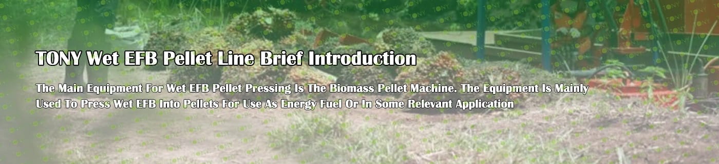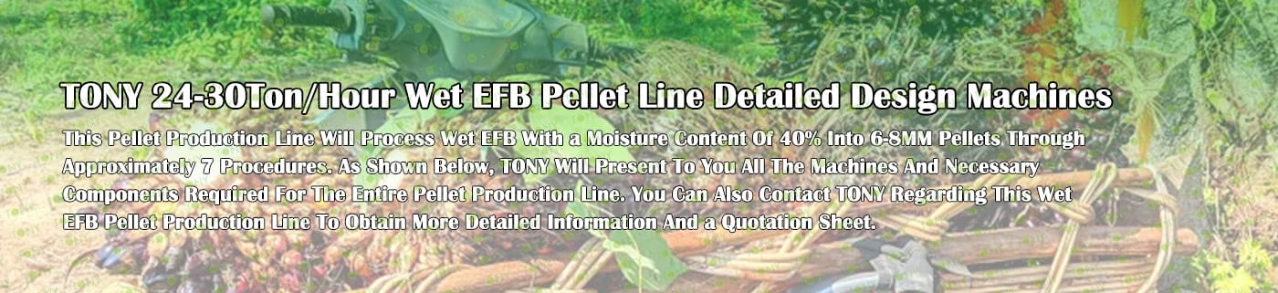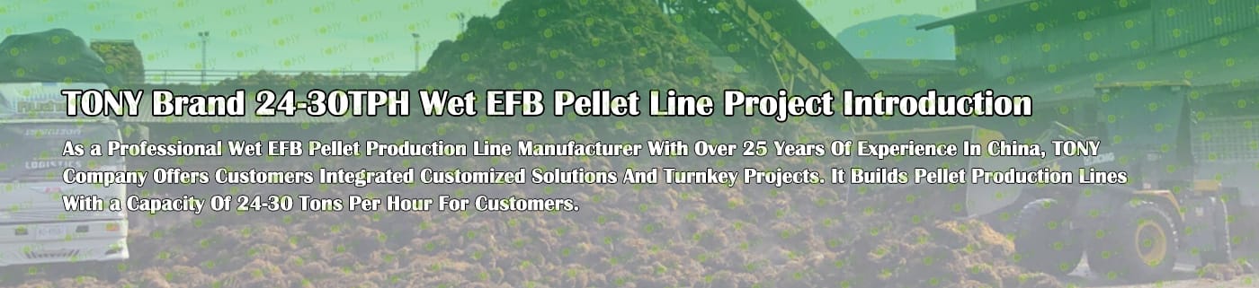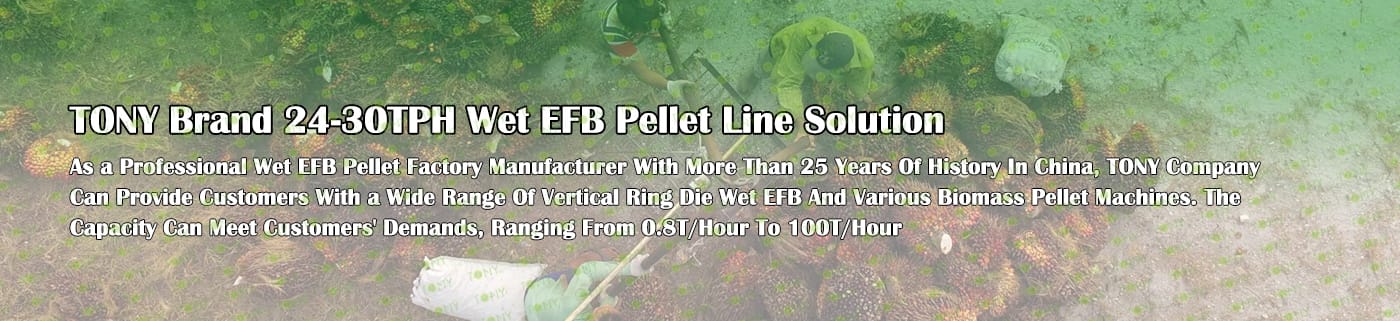 Заводът за производство на пелети с мокър EFB с марка TONY 24-30 тона/час може да използва мокър EFB като основна суровина. След предварителна обработка и обработка се втвърдява в пелетно гориво EFB с висока плътност. Това гориво е идеален заместител на въглищата и петрола и играе роля в енергоспестяването и намаляването на емисиите. В момента той е широко използван в региони, богати на EFB ресурси.