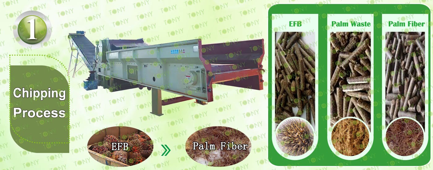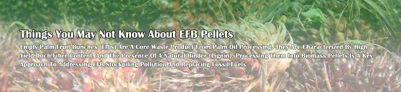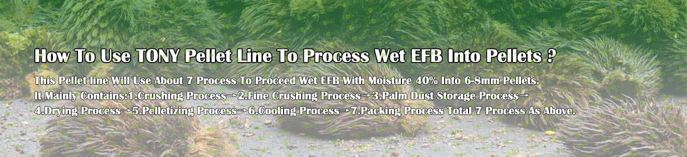 Преработката на EFB (празни гроздове от палмови плодове) в пелети от биомаса е важен начин за реализиране на оползотворяването на ресурсите от палмови отпадъци и замяна на енергията от изкопаеми горива. Ядрото на процеса е да се преобразува насипен EFB с висока влажност в чисто гориво с висока плътност, лесно за съхранение и транспорт чрез процеса на „предварителна обработка – сушене – раздробяване – пелетизиране – охлаждане и опаковане“.