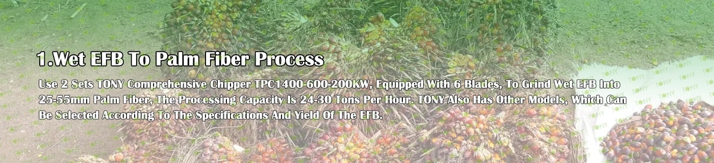 A. Този процес се използва главно за смилане на EFB в палмово влакно с размер 25-55 мм. Размерът на окончателното палмово влакно може да се регулира чрез промяна на различни размери на ситата и добавяне на летящи ножове в машината за дробене на дървесина.