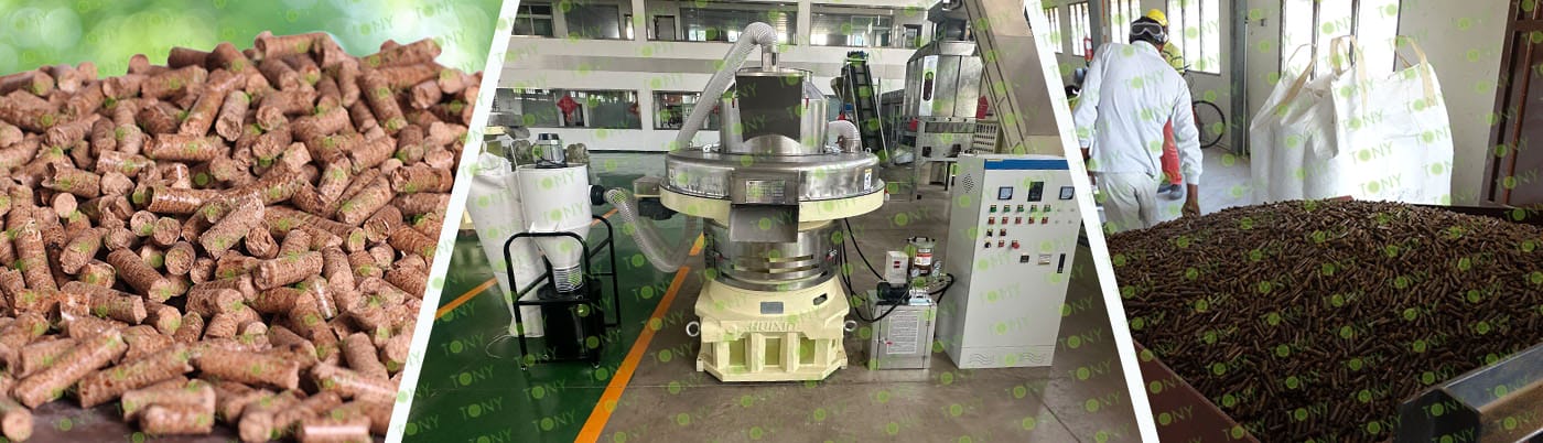 6. Основно оборудване: Изчерпателна дробилка- TPC1400-600-200KW, ефективна чукова мелница-TFD85*220-220KW, голям хидравличен силоз за съхранение TONY, сушилня с ротационен барабан-2*24m, пелетна машина TONY-TYJ860-Ⅲ-280KW, охладител за поцинковани пелети, Машина за пакетиране на тонове и лентови транспортьори