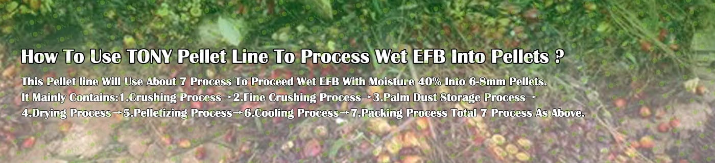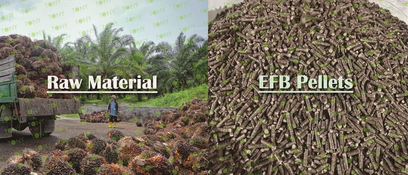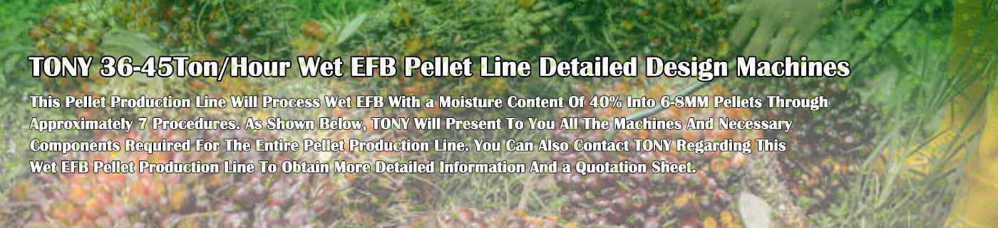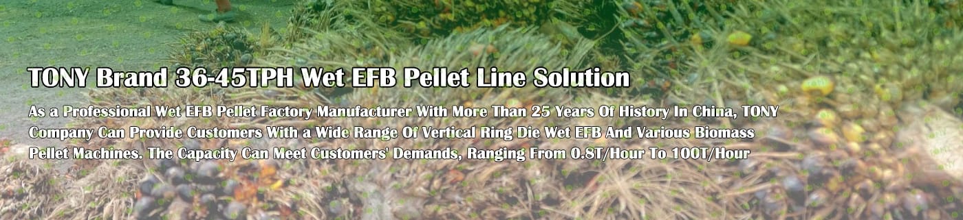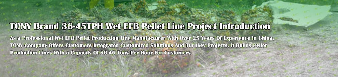 Заводът за производство на пелети с мокър EFB с марка TONY 36-45 тона/час може да използва мокър EFB като основна суровина. След предварителна обработка и обработка се втвърдява в пелетно гориво EFB с висока плътност. Това гориво е идеален заместител на въглищата и петрола и играе роля в енергоспестяването и намаляването на емисиите. В момента той е широко използван в региони, богати на EFB ресурси.