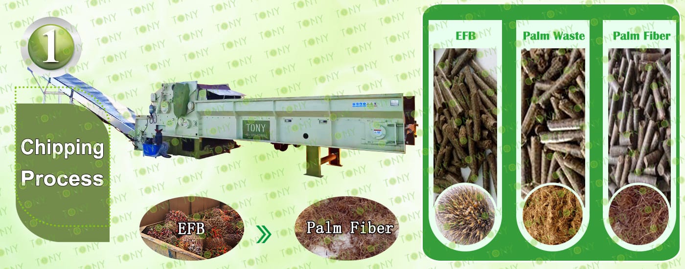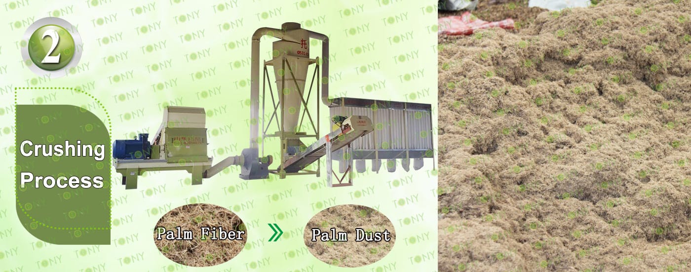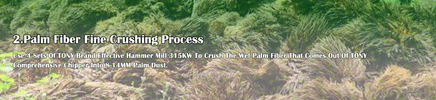 A. Този процес се използва главно за смачкване на 25-55 mm палмови влакна в 8-14 mm палмов прах.