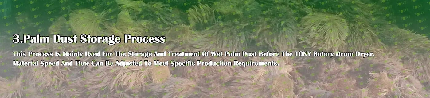 B. Голям хидравличен силоз за съхранение на марката TONY за съхранение на палмовия прах, който излиза от чуковата мелница. Този процес може да бъде по избор от клиента. Ако клиентът не избере контейнера за съхранение, той може да съхранява палмовия прах директно на земята, което може да изисква малко труд.