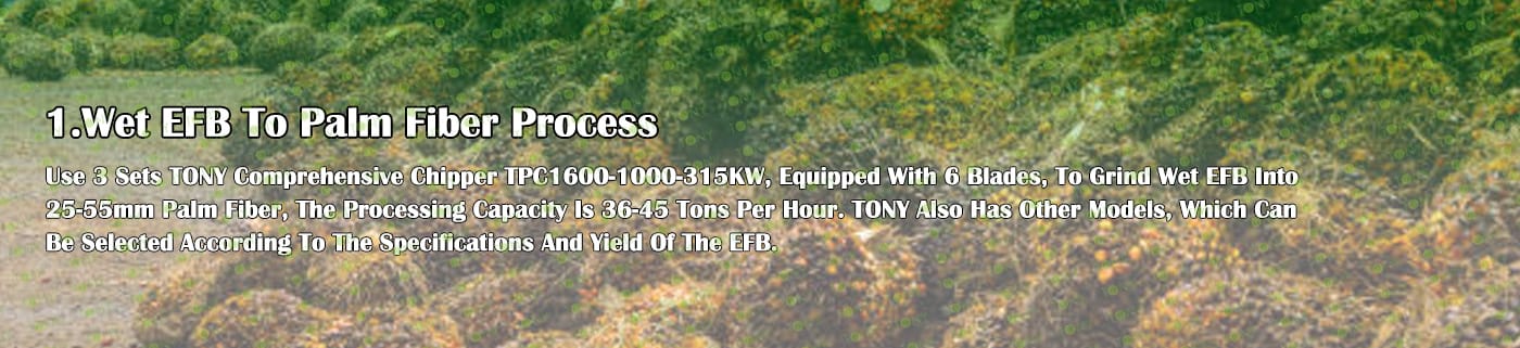 A. Този процес се използва главно за смилане на EFB в палмово влакно с размер 25-55 мм. Размерът на окончателното палмово влакно може да се регулира чрез промяна на различни размери на ситата и добавяне на летящи ножове в машината за дробене на дървесина.