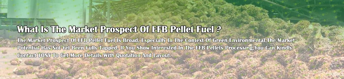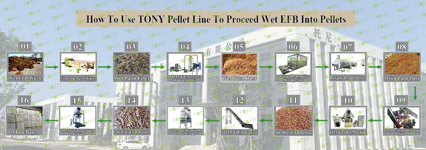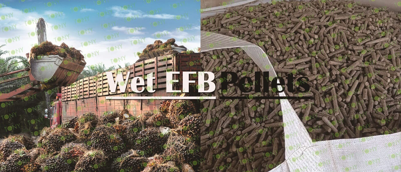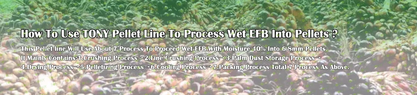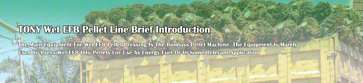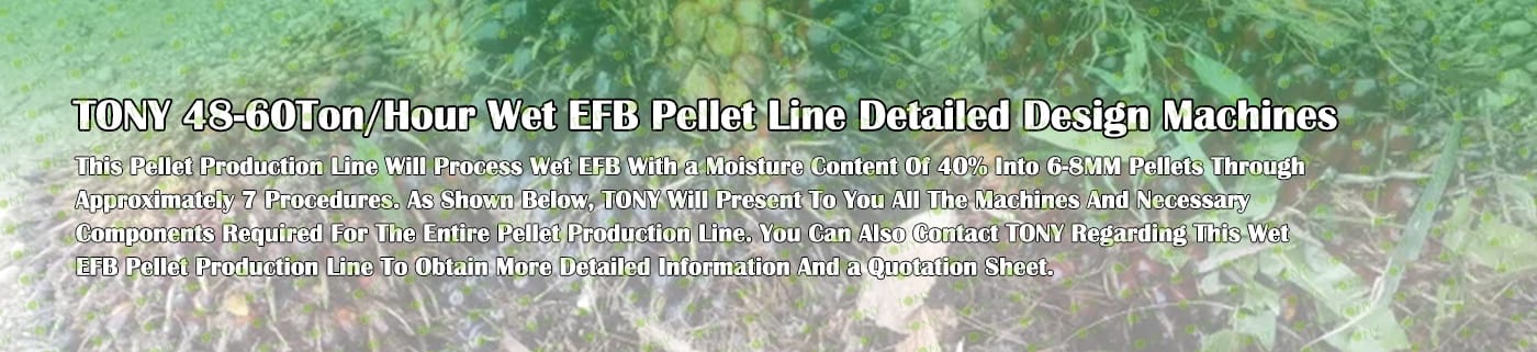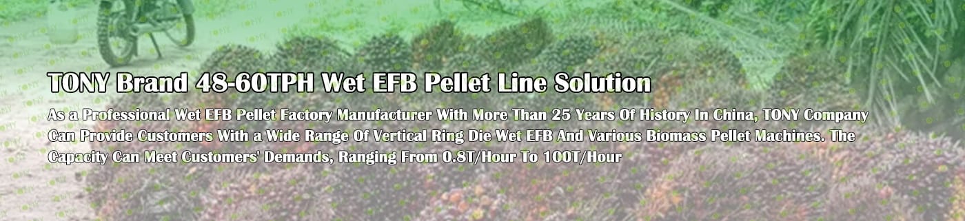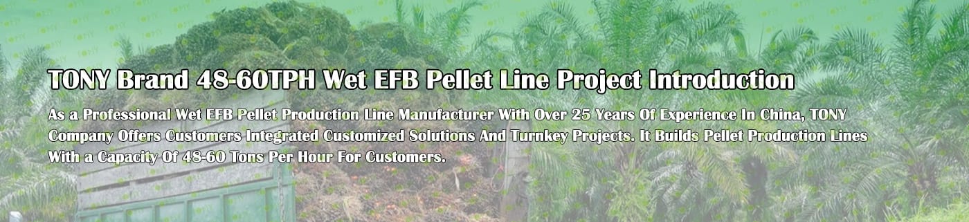 Заводът за производство на пелети с мокър EFB с марка TONY 48-60 тона/час може да използва мокър EFB като основна суровина. След предварителна обработка и обработка се втвърдява в пелетно гориво EFB с висока плътност. Това гориво е идеален заместител на въглищата и петрола и играе роля в енергоспестяването и намаляването на емисиите. Понастоящем той се използва широко в региони, богати на EFB ресурси.