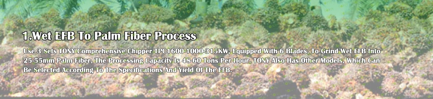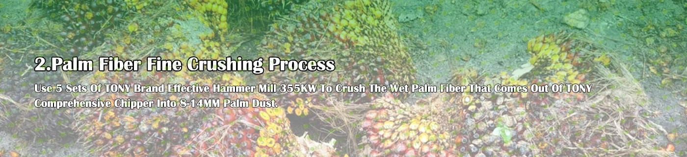 A. Този процес се използва главно за смачкване на 25-55 mm палмови влакна в 8-14 mm палмов прах.