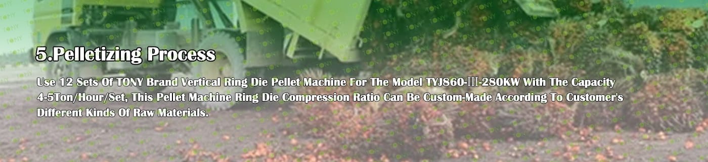 6. Основно оборудване: Изчерпателна дробилка- TPC1600-1000-315KW, ефективна чукова мелница-TFD120*200-355KW, голям хидравличен силоз за съхранение TONY, сушилня с ротационен барабан-3,2*28m, машина за пелети TONY- TYJ860-Ⅲ-280KW, поцинкована Охладител за пелети, машина за пакетиране на тонове и лентови транспортьори