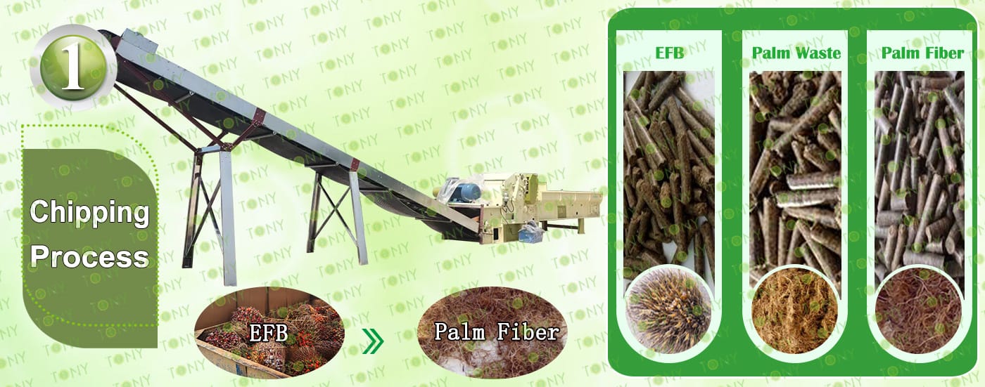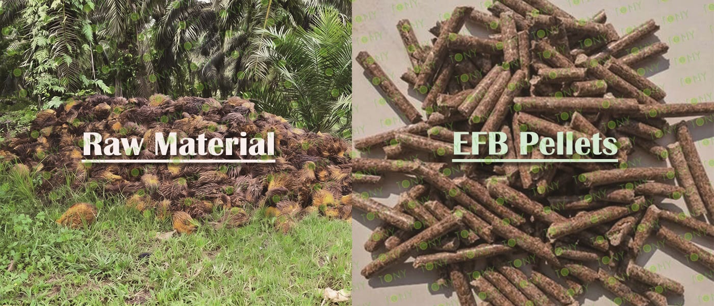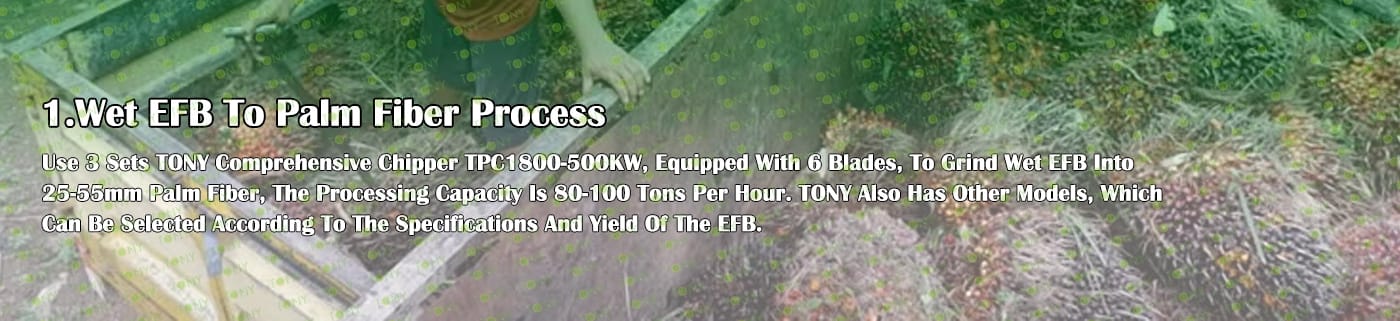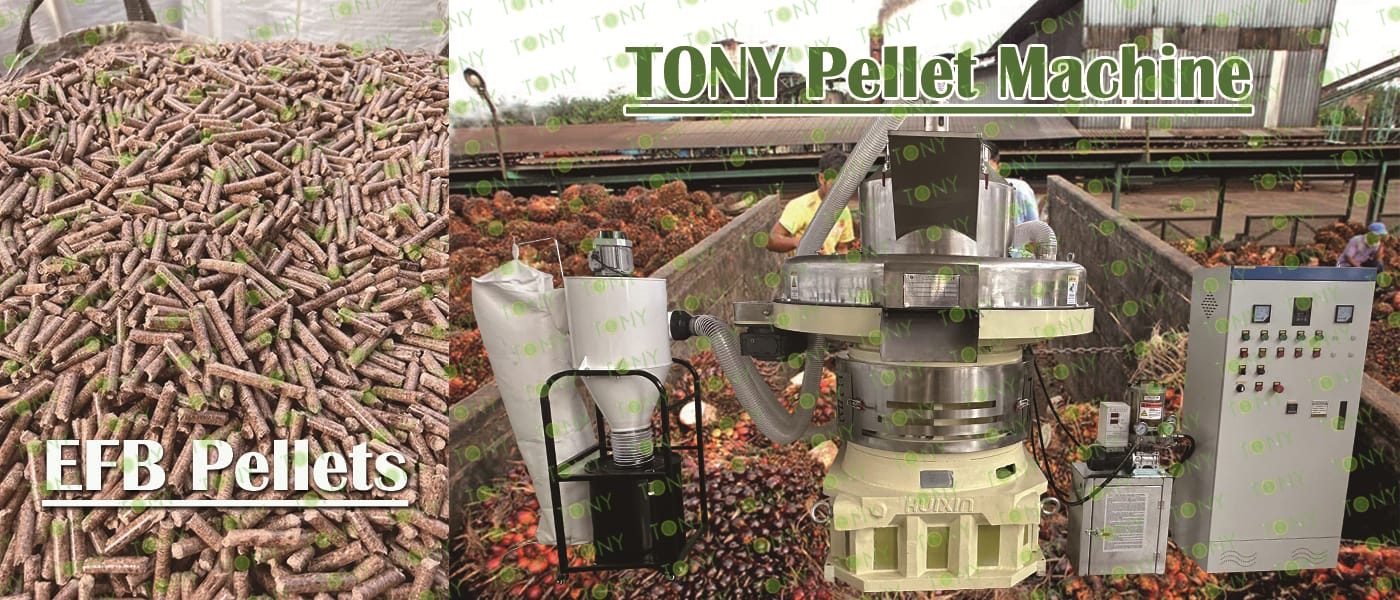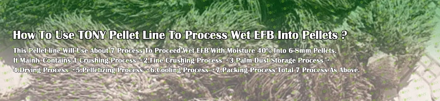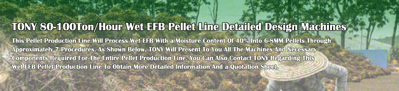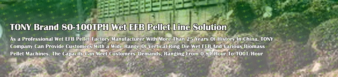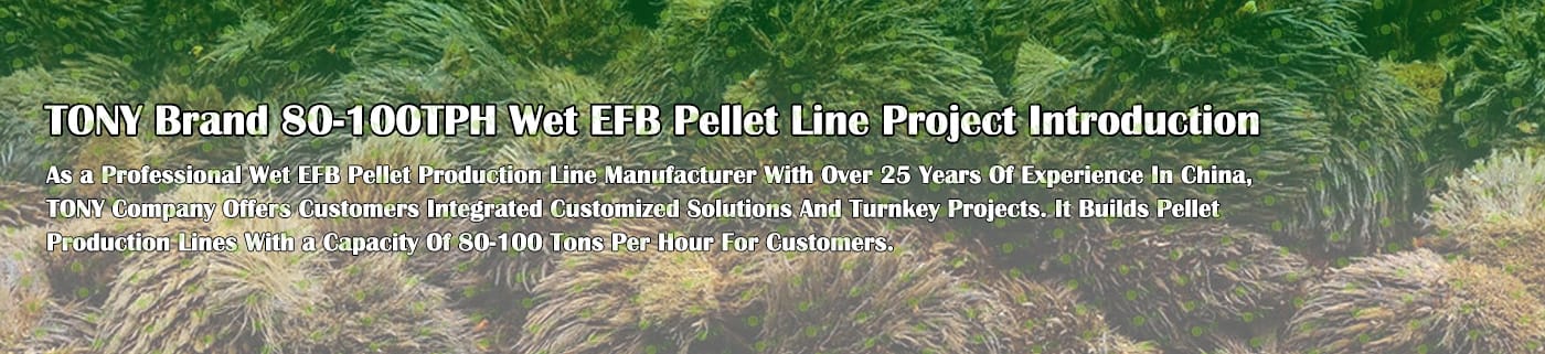 Заводът за производство на пелети с мокър EFB с марка TONY 80-100 тона/час може да използва мокър EFB като основна суровина. След предварителна обработка и обработка се втвърдява в пелетно гориво EFB с висока плътност. Това гориво е идеален заместител на въглищата и петрола и играе роля в енергоспестяването и намаляването на емисиите. Понастоящем той се използва широко в региони, богати на EFB ресурси.