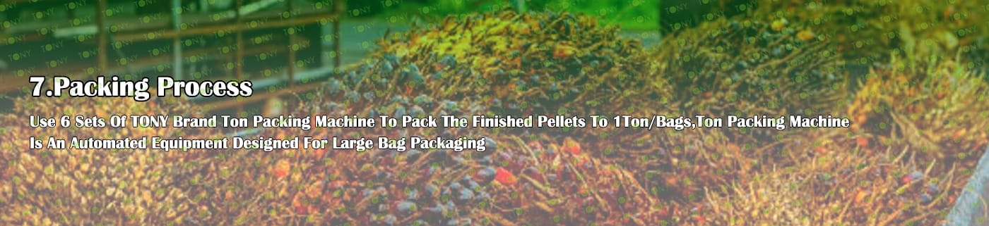 6. Основно оборудване: Изчерпателна дробилка- TPC1800-500KW, ефективна чукова мелница-TFD1600-500KW, голям хидравличен силоз за съхранение TONY, сушилня с ротационен барабан-3,5*28m, пелетна машина TONY- TYJ860-Ⅲ-280KW, охладител за поцинковани пелети, опаковка в тонове Машинни и лентови транспортьори