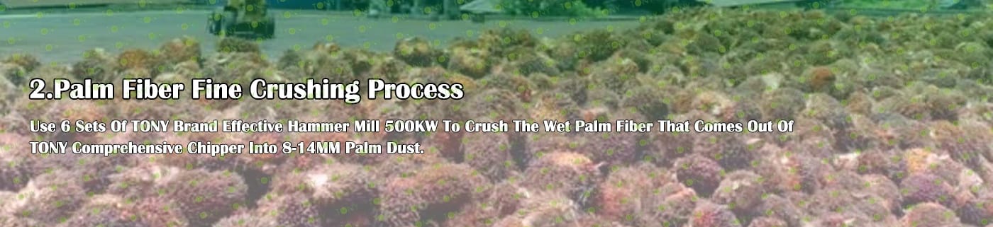 A. Този процес се използва главно за смачкване на 25-55 mm палмови влакна в 8-14 mm палмов прах.