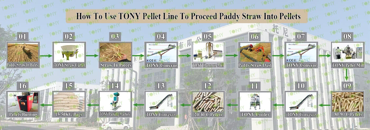 TONY Brand 6-8Ton/Hour paddy straw pellet manufacturing plant can process paddy straw ,stlak,It is widely used in poultry feed, cattle, sheep and horse feed. It can also replace coal for burning.