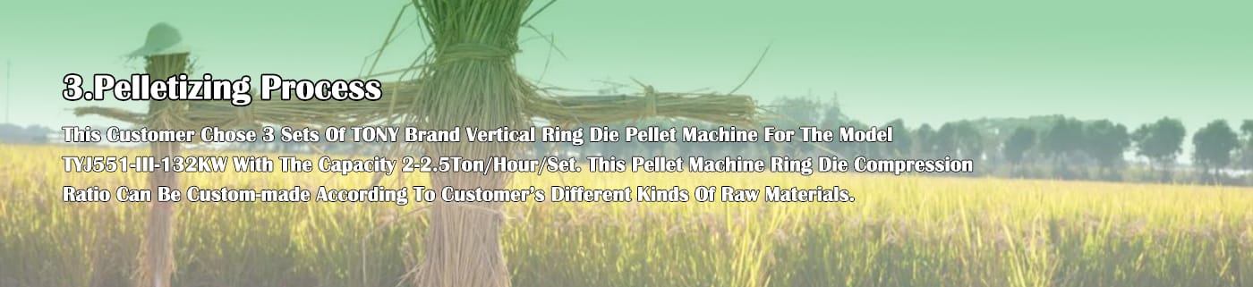 3.Pelleting Process: A. This process is mainly used to To Products Pellets With φ6-8mm. B. Capacity:6-8Ton/Hour. C. The Customer Chose 3 Sets Of TONY Brand Vertical Ring Die Pellet Machine TYJ551-III-132KW With Capacity 2-2.5Ton/Hour. Main Parts: (1)TONY's new vertical ring die pellet machine (2)Cyclone and bags dust collectors. (3)Bearings automatic lubrication system. (4)Electrical cabinets. You can chose TONY new type SS304 pellet machine or old type MS pellet machine. |
