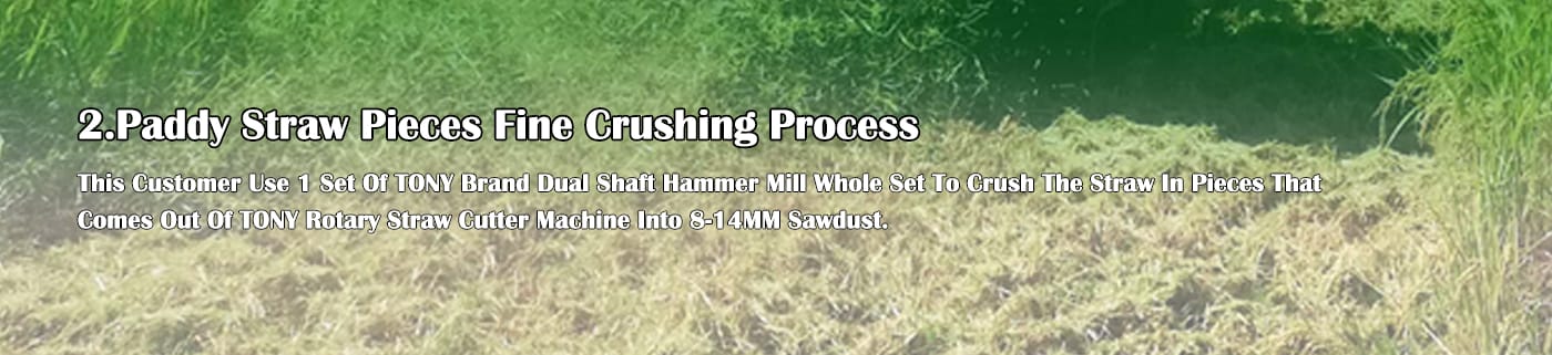 1.Grinding Process: A.This process is mainly used to grind the paddy straw into paddy straw pieces with size 35-55mm. The finish straw pieces size can be adjustable by changing different sizes of screeners and adding flying knives inside the straw cutter. B.This customer use TONY Brand TPX-3000 model with 6 flying baldes type: Main Parts: (1)TONY's new Rotary Cutter. (2)Feed and unload belt frequency control to prevent card material (3)Hydraulic system control for more thickness of raw materials (4)Electronic control system allows the equipment to be used normally (5)Contact TONY for more details with quotation. |